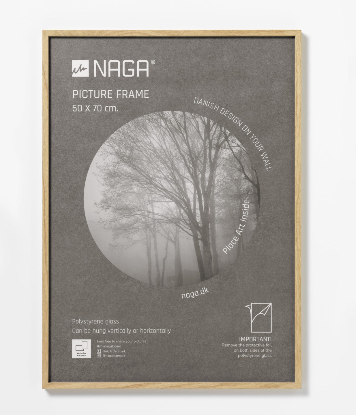 50×70 ramme til plakater i massivt egetræModerne ramme til plakater med plexiglas udført i massivt FSC certificeret egetræ. Den flotte ramme passer til et billede på 50×70 cm. Trærammen måler 1,2 cm i bredden og 2,2 cm i dybden og giver et stilfuldt udtryk.Den fine ramme har metalophæng bagpå, så du nemt kan hænge den op. Rammen er udført så du både kan hænge den vertikalt og horisontalt, på den måde kan du skabe den helt rette billedvæg.En tidløs ramme, som du kan få glæde af i mange år. Indram plakater og skab et flot design på dine vægge.