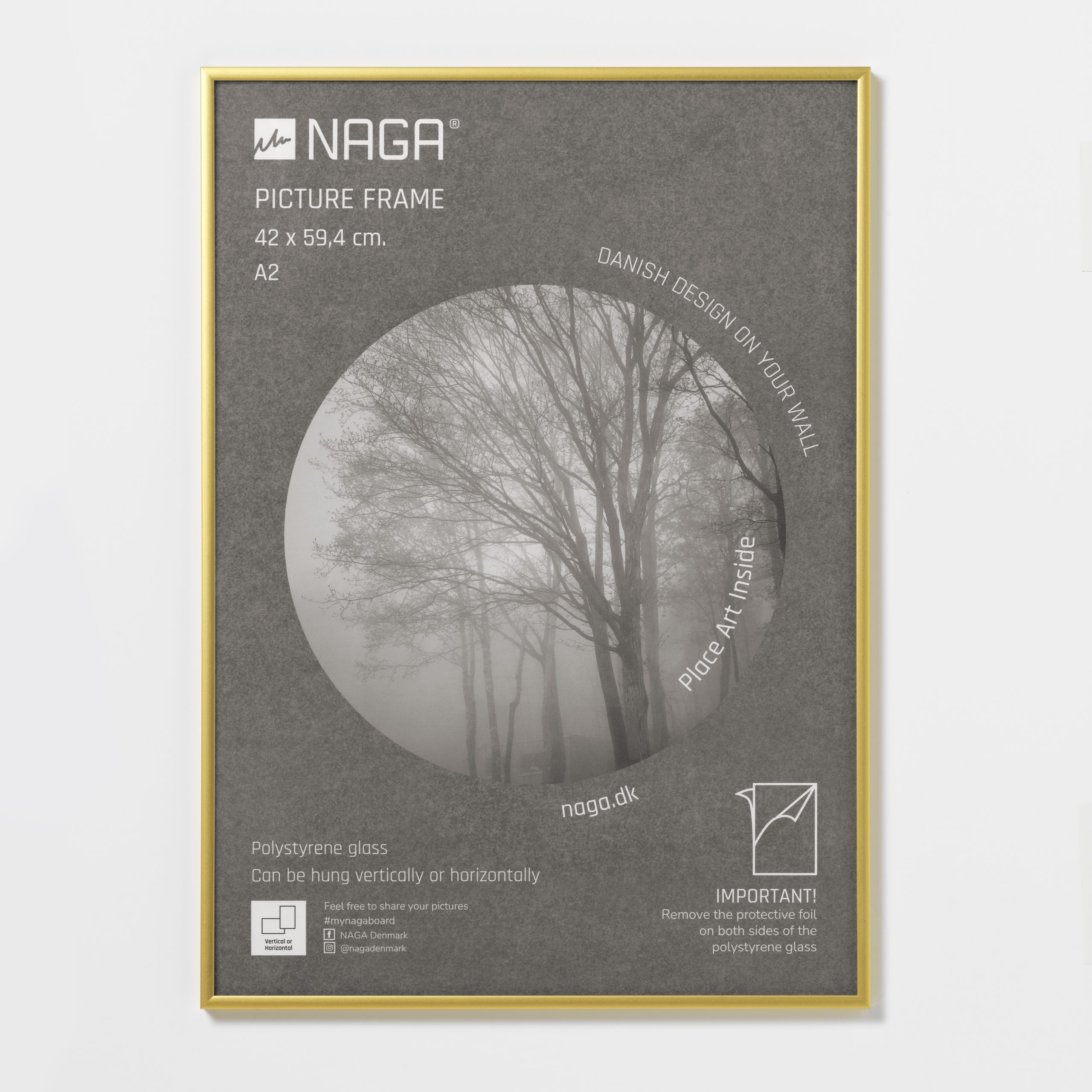 A2 mat guld billedramme i aluminium Stilfuld mat guld ramme med plexiglas udført i aluminium. Den flotte ramme passer til et billede på 42×59,4 cm (hvad der svarer til en A2 plakat). Selve rammen måler 0,9 cm i bredden og 1,4 cm i dybden, hvilket giver et stilfuldt udtryk.Den fine ramme har metalophæng bagpå, så du nemt kan hænge den op. Rammen er udført så du både kan hænge den vertikalt og horisontalt, hvilket giver dig mulighed for at skabe den perfekte billedvæg.En flot ramme, som du kan få glæde af i mange år. Indram billeder eller kunst og skab et stilfuldt design på dine vægge.