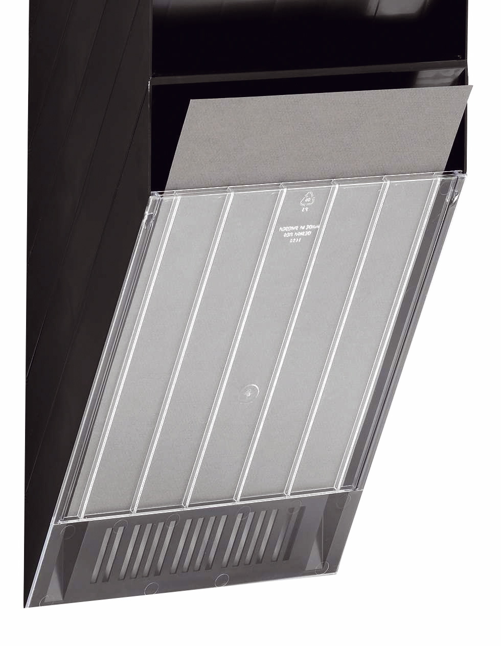 Denne frontplade passer til vores Flexifack brevbakke, der ophænges på væg. Med frontpladen lukker du den nederste brevbakke af og får en pæn afslutning på brevbakkesættet. Frontpladen er lavet i slagfast transparent polystyrenplast så den passer til Flexifack brevbakkerne.