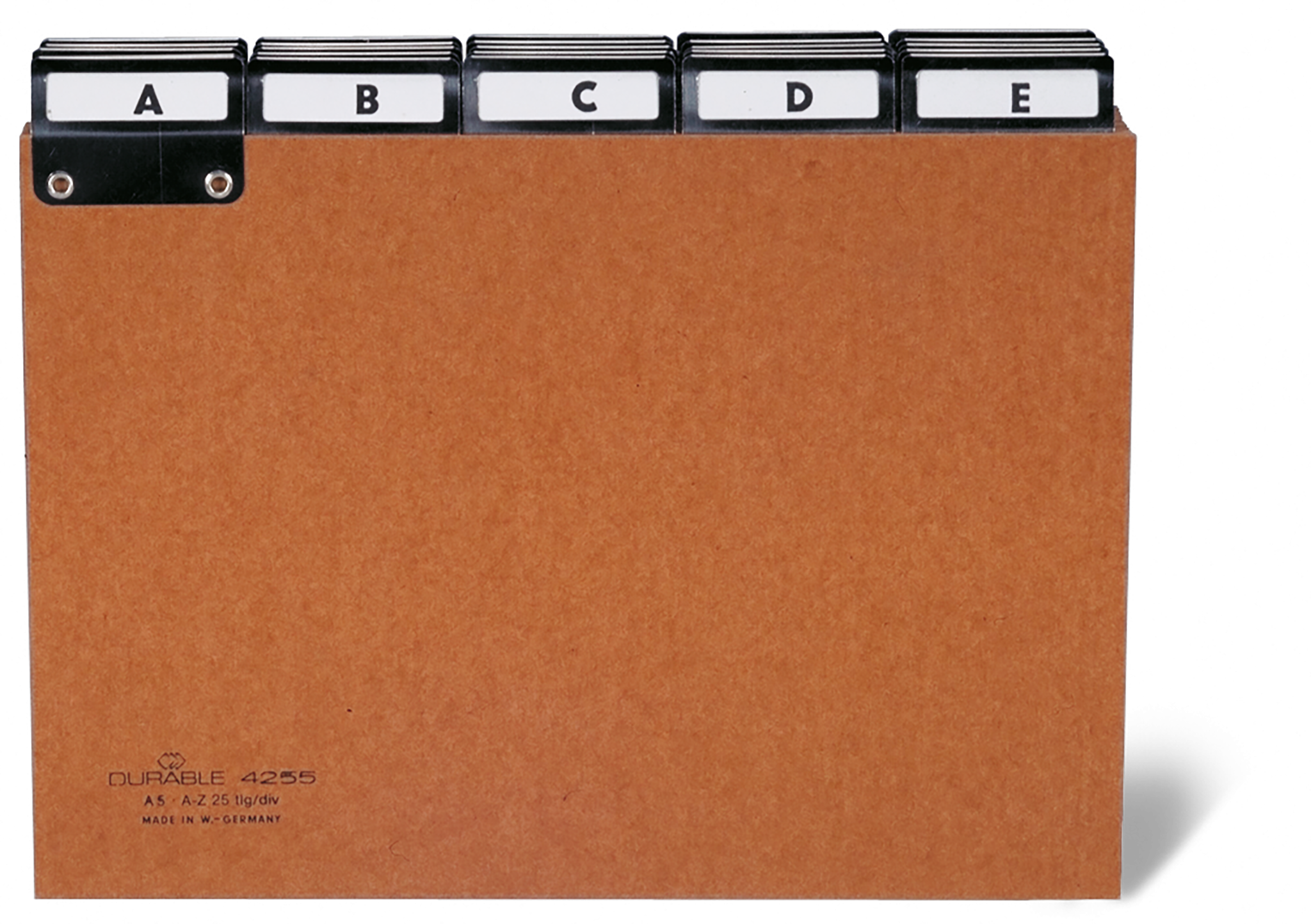 Kartotekskort af pressepap til underinddeling af kartoteker Med fastnittede vinduesfaner med forniklede nitter og tilhørende udskiftelige indstik, blanke og fortrykte Fanebredde: 40 mm Inddeling: 5/5 Materialetykkelse: 0,6 mm, af pressepap Format: A5 tvær