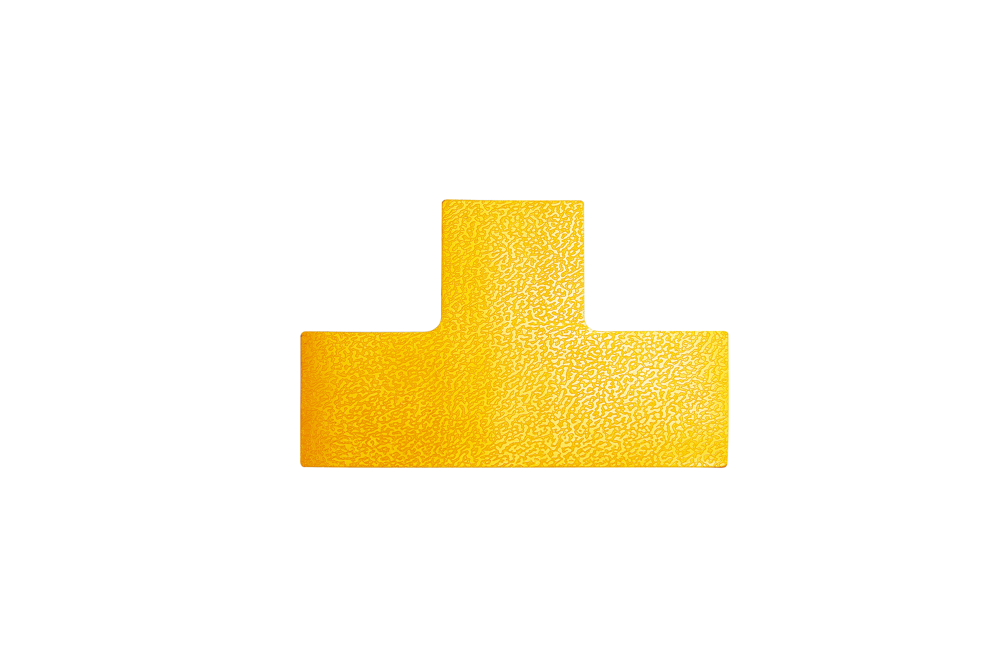 Gulvmarkering til identifikation af farlige områder, opbevaringsrum,gangbroer m.m. Selvklæbende permanent gulvmarkering “T-form” til påsætning på indendørs gulve. Slidstærk og hårdfør. Skridsikring R9 i henhold til DIN 51130. Farve: RAL 1003 signalgul. Mål ( B x H x L ) 100 mm x 0,7mm x 150 mm