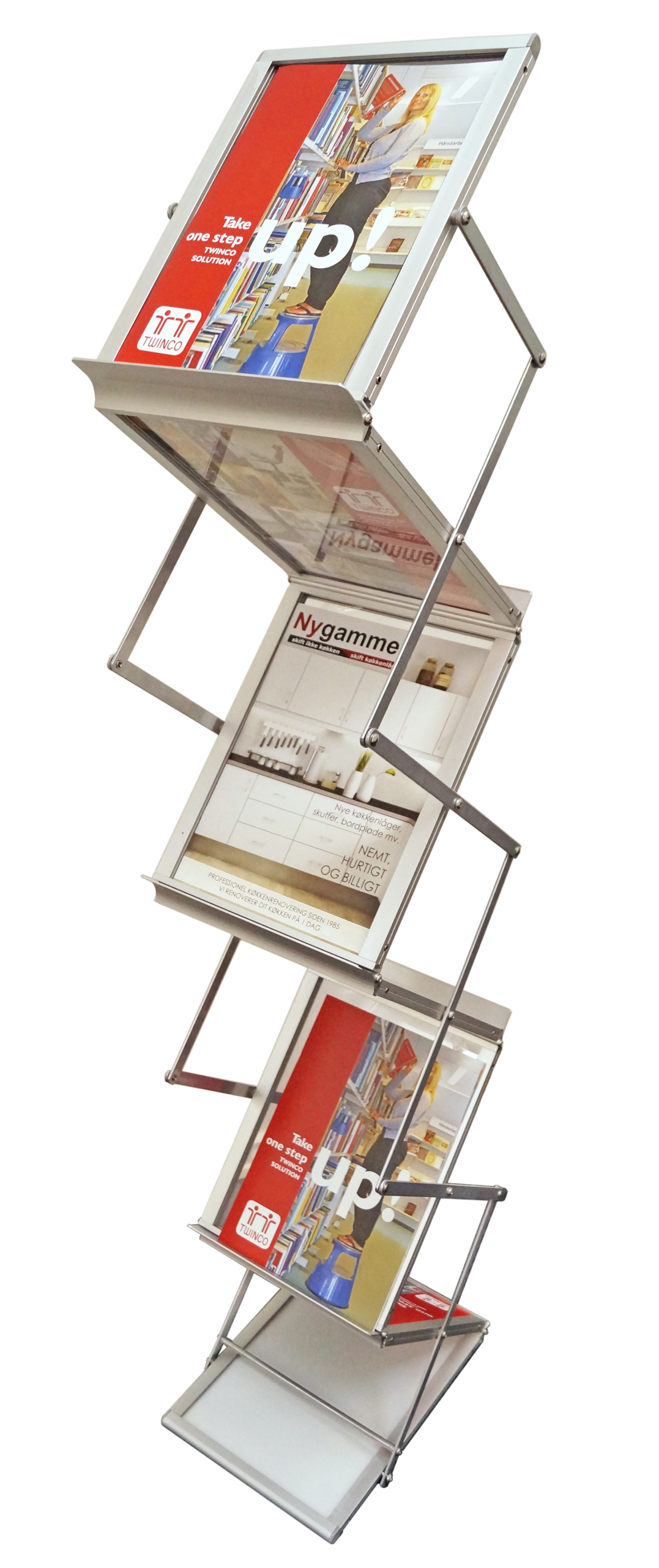 Zig Zag Brochureholder – en elegant sammenklappelig Zig Zag Brochureholder til seks A4 brochurer. Denne Brochureholder er udført i aluminium, den er enkel og hurtig at stille op. Hurtig og nem når du skal på messe eller have stående i receptionen. Der medfølger en lækker canvastaske.