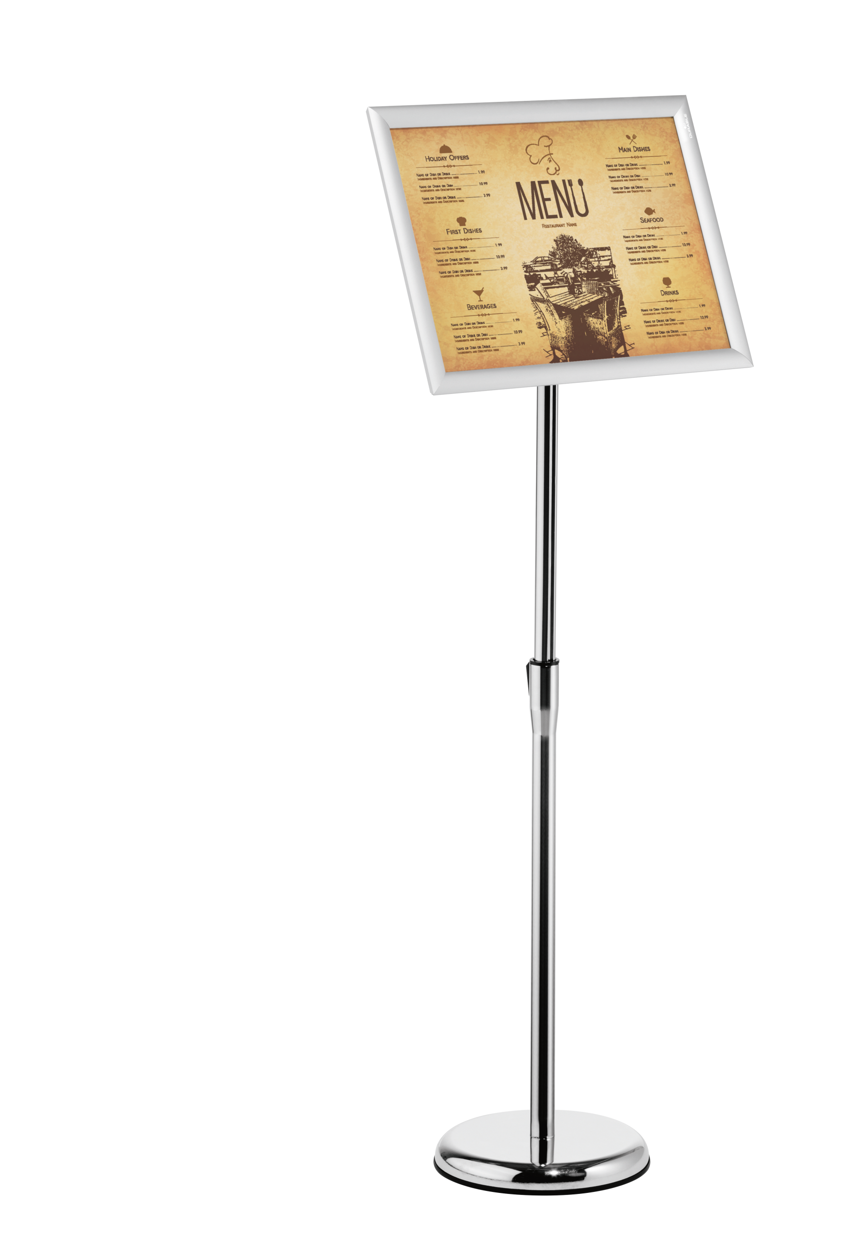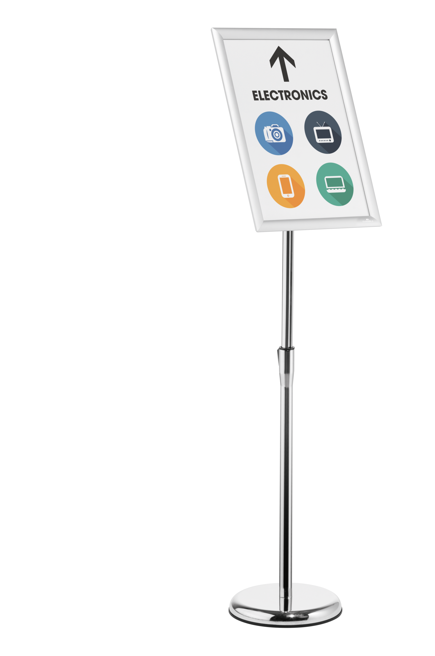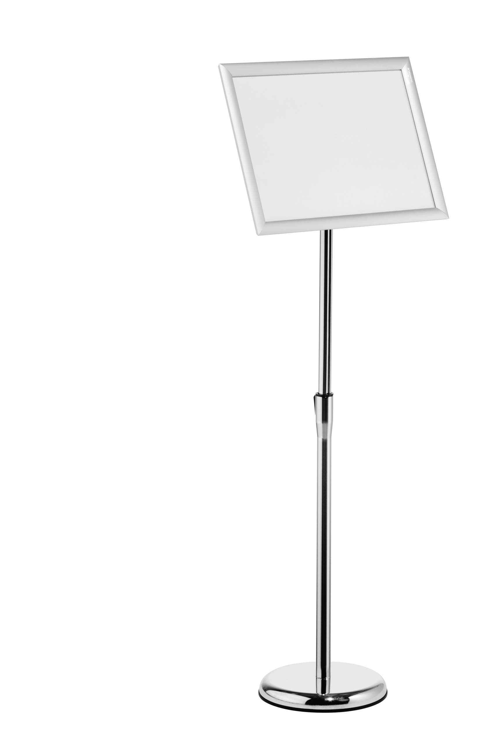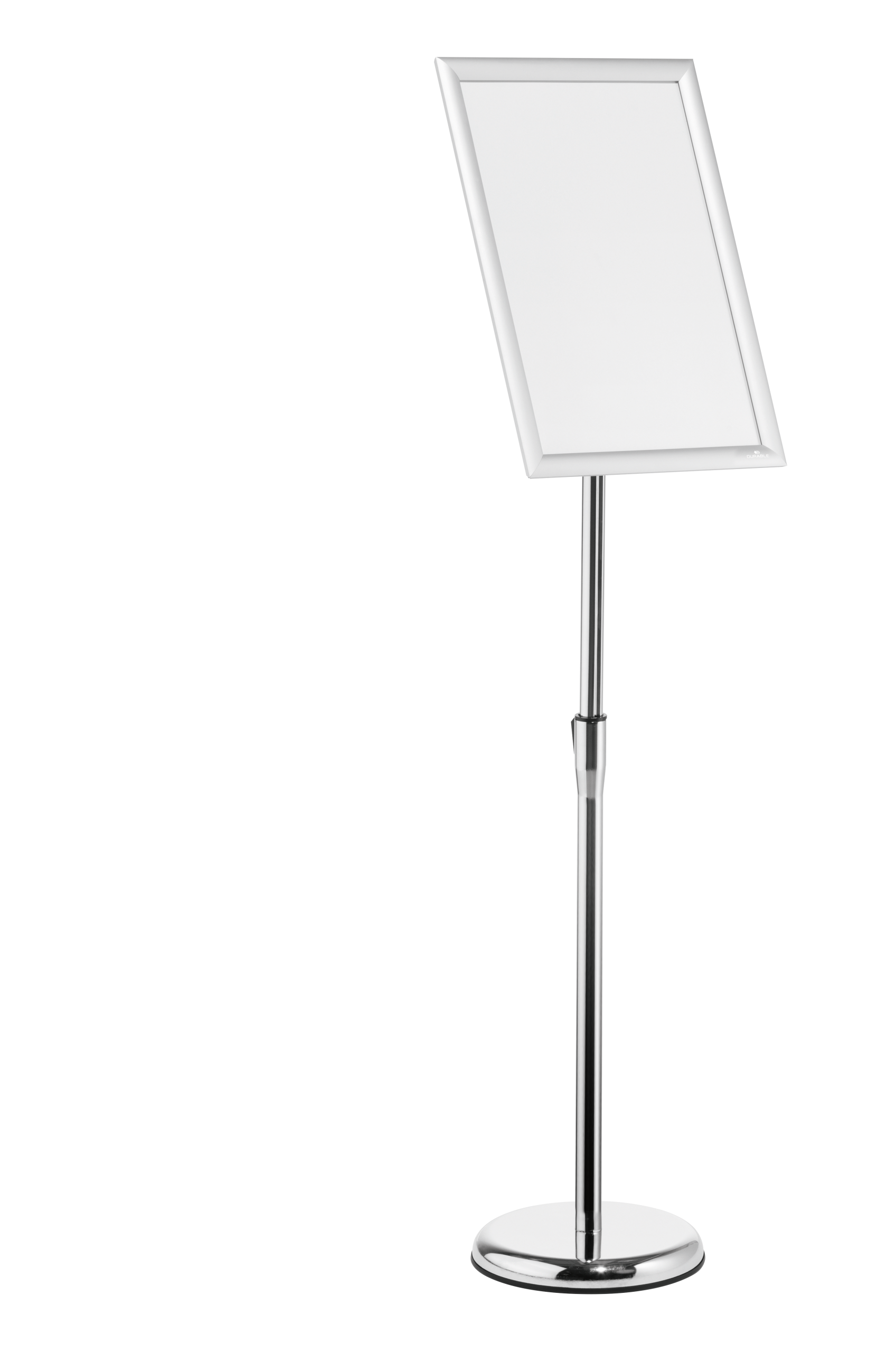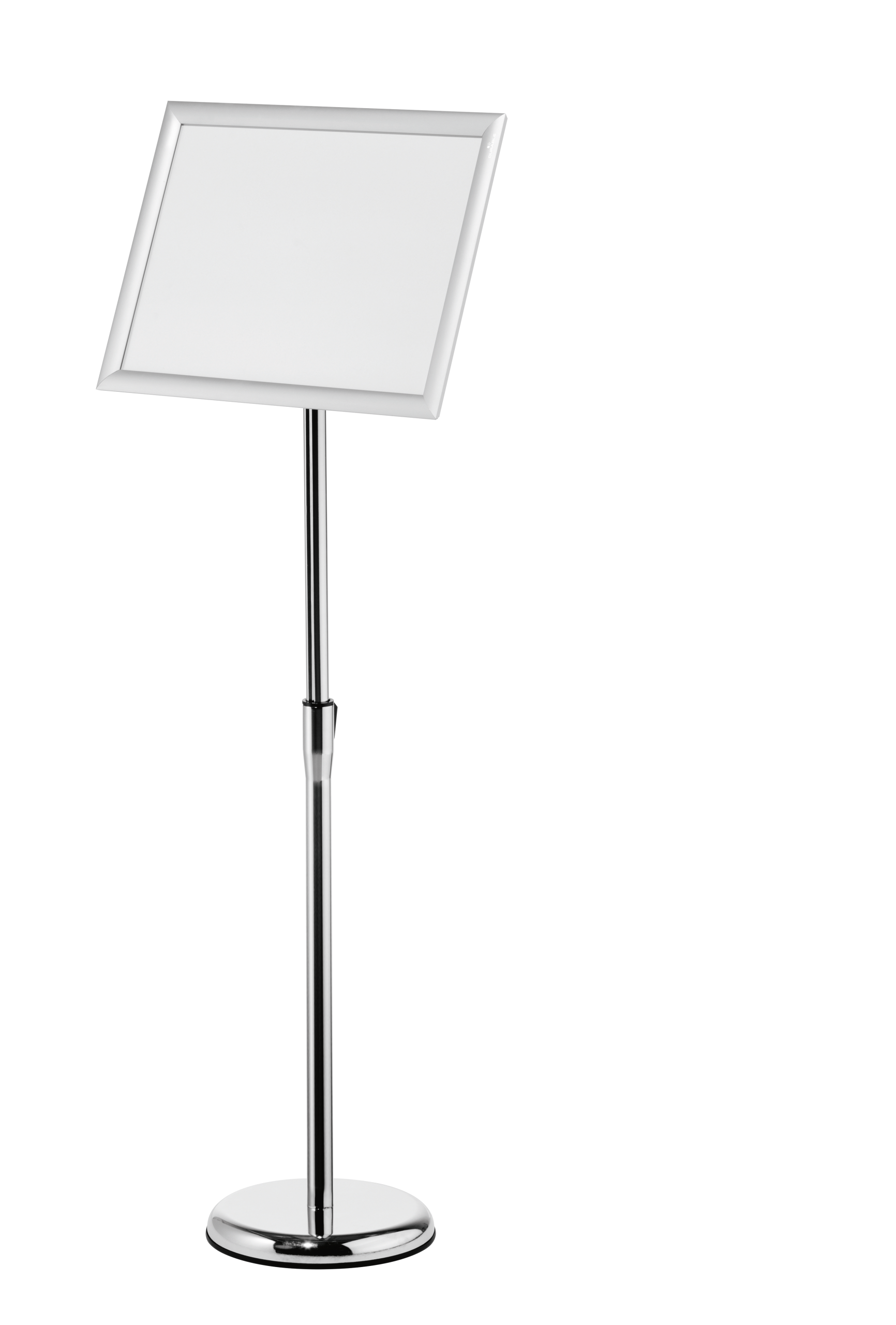 Gulvskilt med klikramme og forkromet teleskopstativ, der kan justeres fra 86 til 129 cm (i A3-format). Meget anvendelig på museer, udstillinger, receptioner og andre steder, hvor der skal vises information, som kan have behov for at blive udskiftet fra tid til anden. Skift dokumentet ved at folde alle 4 sideprofiler op og fjerne den UV-bestandige og antireflekterende plastfront, der beskytter materialet. Rammen er fremstillet af en anodiseret aluminiumprofil, hvilket gør aluminiumoverfladen mere holdbar. Informationsstanderens bagside er fremstillet af holdbart polystyren. Justerbar læsevinkel og kan drejes, så den kan placeres i stående eller liggende format. Rund fod (Ø 25 cm) med en gummiring på undersiden for at beskytte gulvet mod ridser. Foden kan også fyldes med 1,1 kg sand for ekstra stabilitet. Tilbehør: 1,5 kg sand, art.nr. 333516.