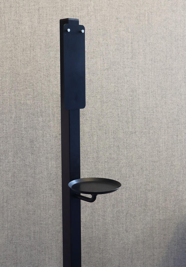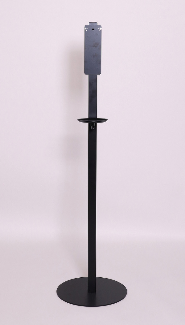 Sort gulvstander med indbygget drypbakke i et simpelt design der passer ind på de fleste arbejdspladser. Designet til brug med de fleste dispensere bl.a. fra Tork og Purel.