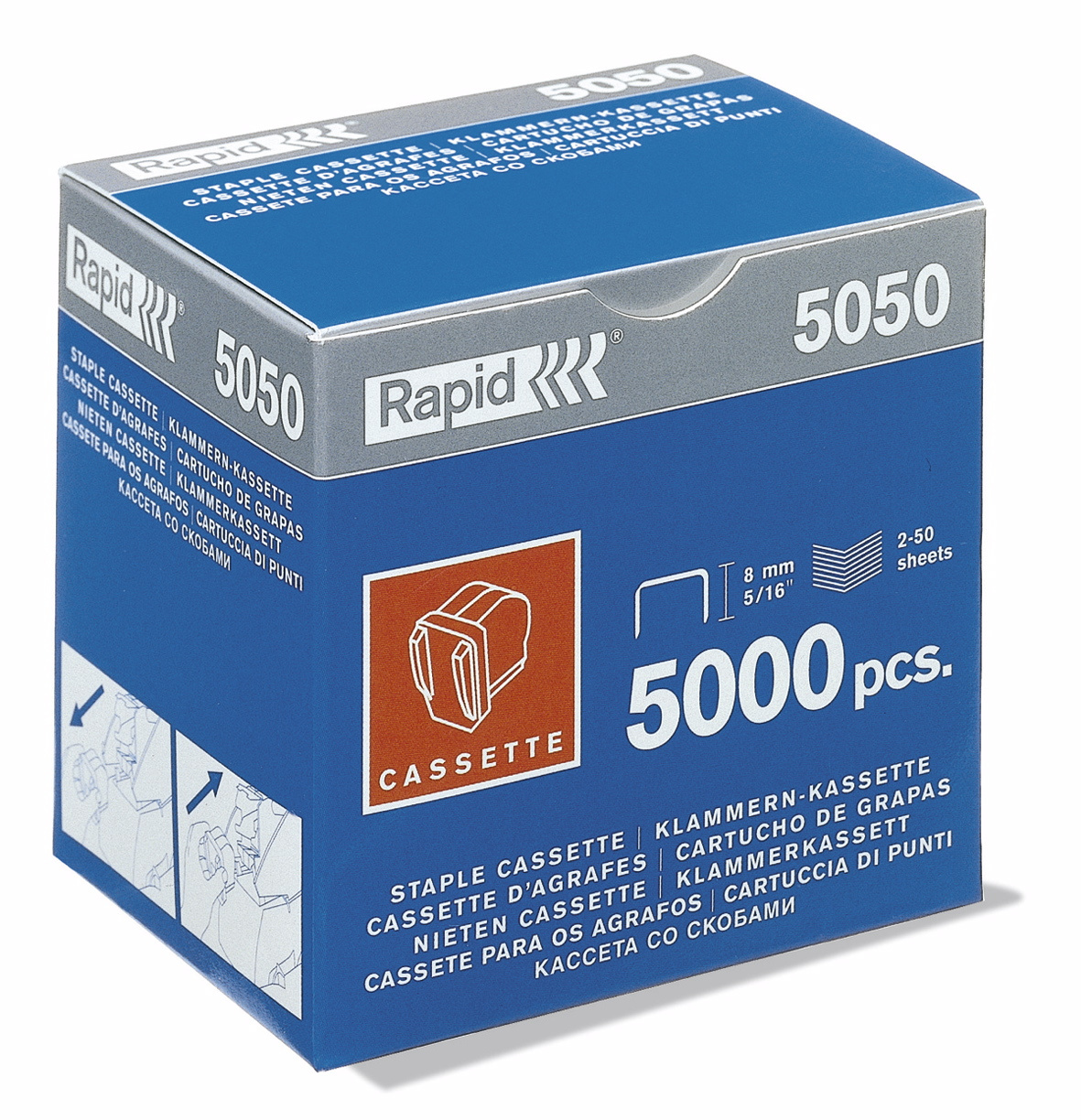 Hæfteklammekassette til Rapid 5050E hæftemaskinen. Kassetten indeholder 5000 hæfteklammer.