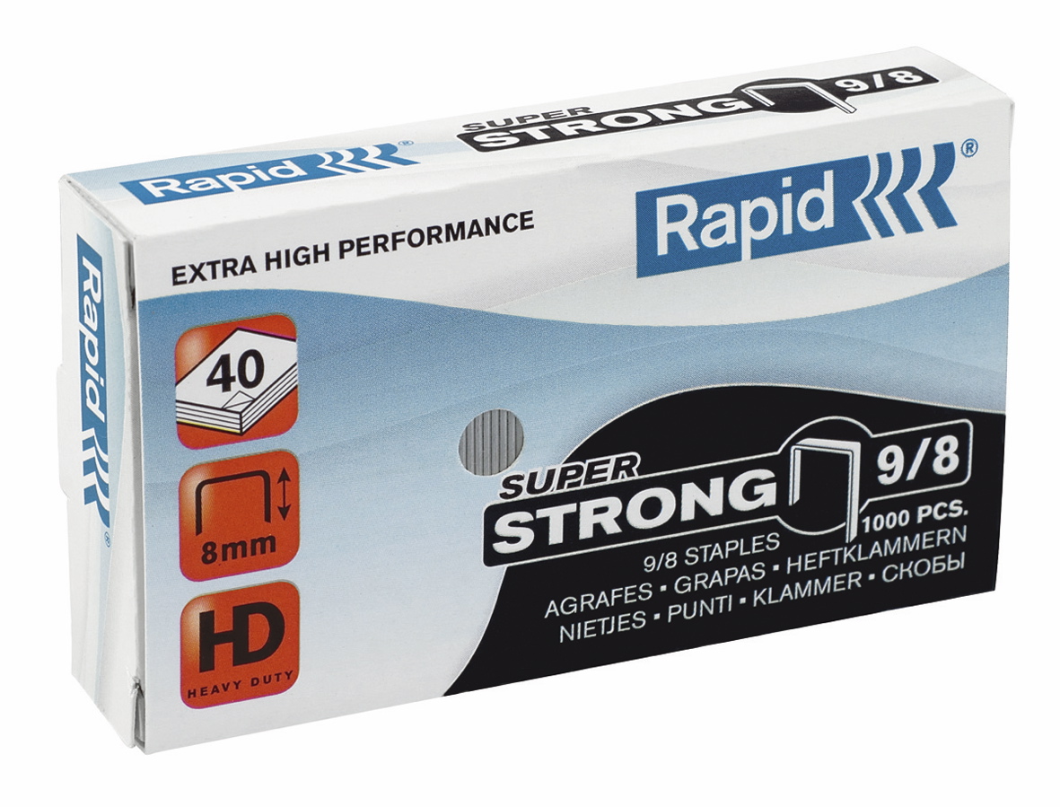 Æske med 5000 hæfteklammer i størrelsen 9/8. Ekstra stærke hæfteklammer med skarp spids, der nemt kan hæfte op til 40 ark 80g papir af gangen.