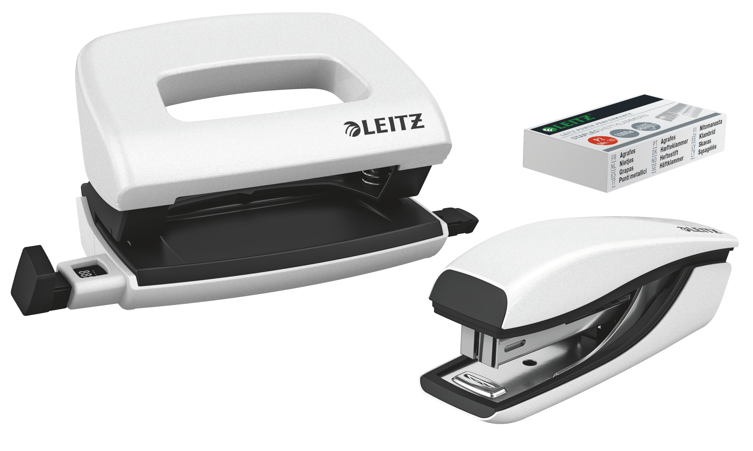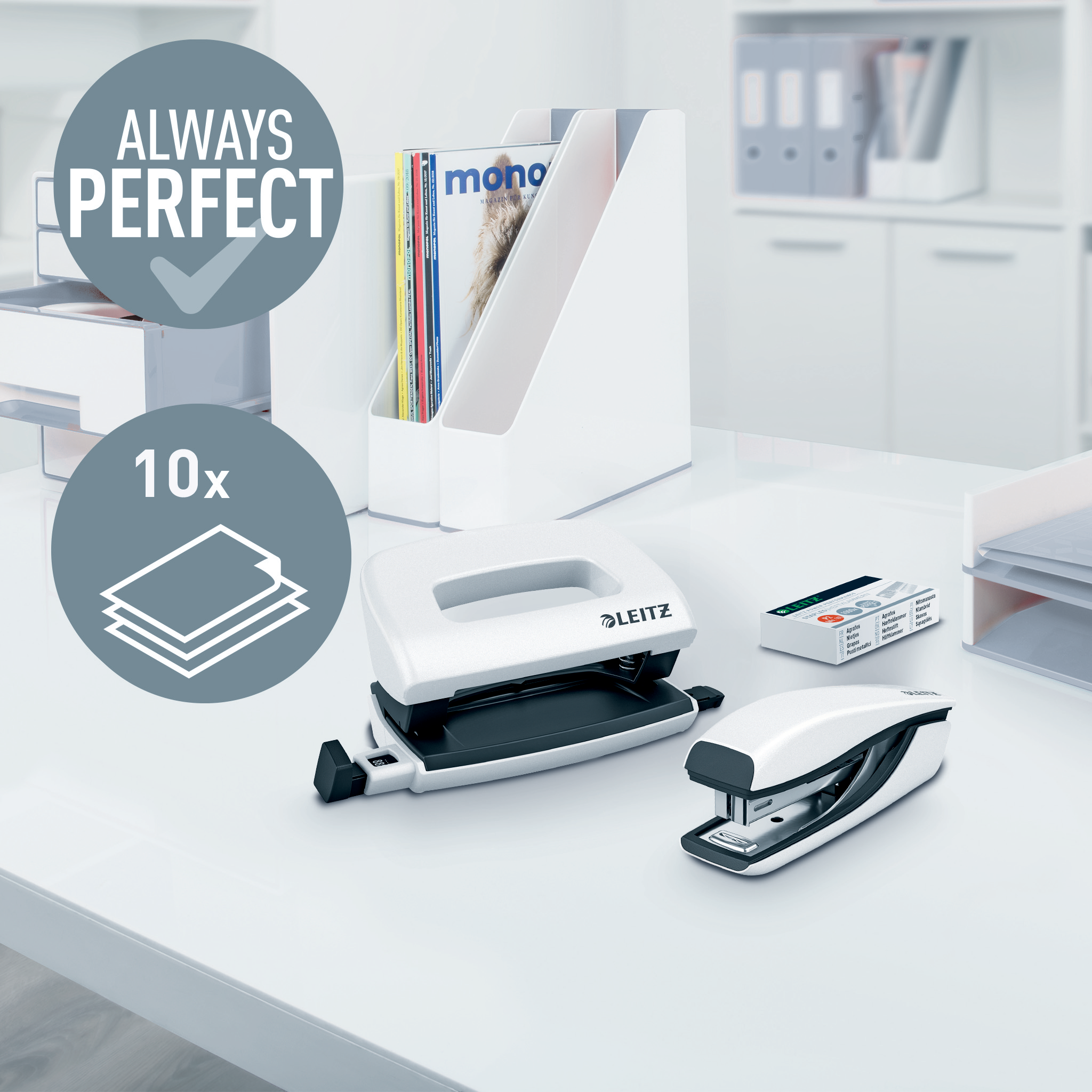 10 ark. Metal mini hæftemaskine og hulapparat til brug på kontoret og på farten. Inklusiv hæfteklammer, i blisterpakning