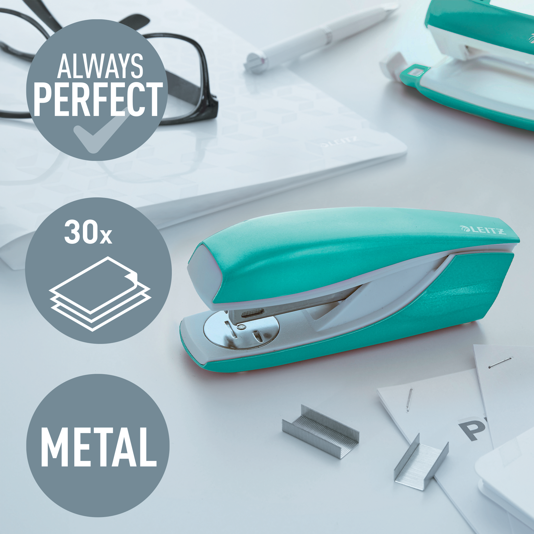 Hæftemaskine i metal med slående WOW farver, som lader din personlighed skinne igennem. Til hverdagsbrug. Robust og pålidelig. Patenteret Direct Impact teknologi og Leitz Power Performance hæfteklammer P3 (24/6, 26/6) sikrer perfekt hæftning hver gang.
