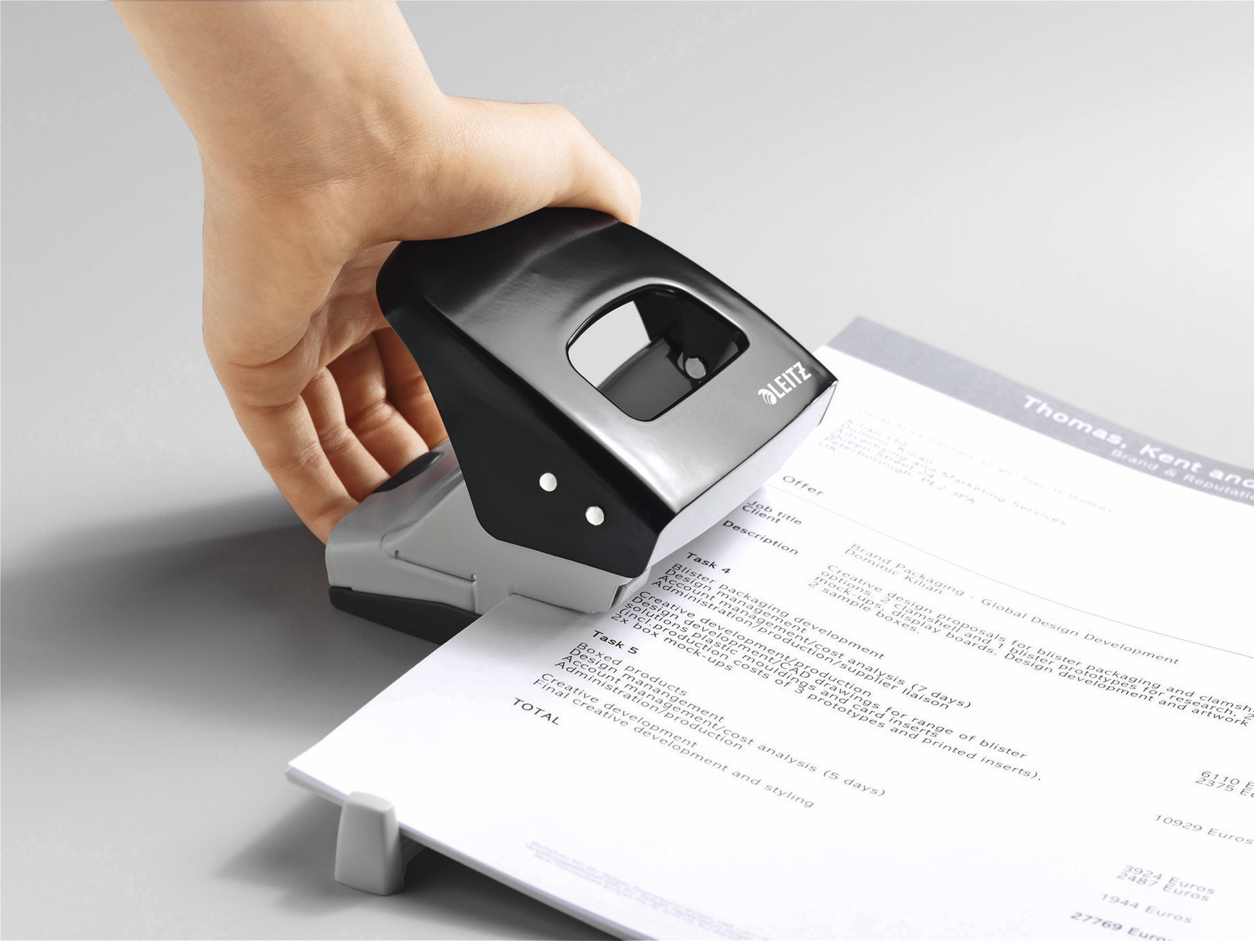 Leitz 5008 er en hulmaskine med patenteret greb og ekstra skarpe hulpiber, der gør det nemt og effektivt at hulle selv store stakke med papir. Hulmaskinen har klare papirformat-angivelser og en stærk papirguide der sikrer, at du nemt får sat hullerne det rigtige sted hver gang.