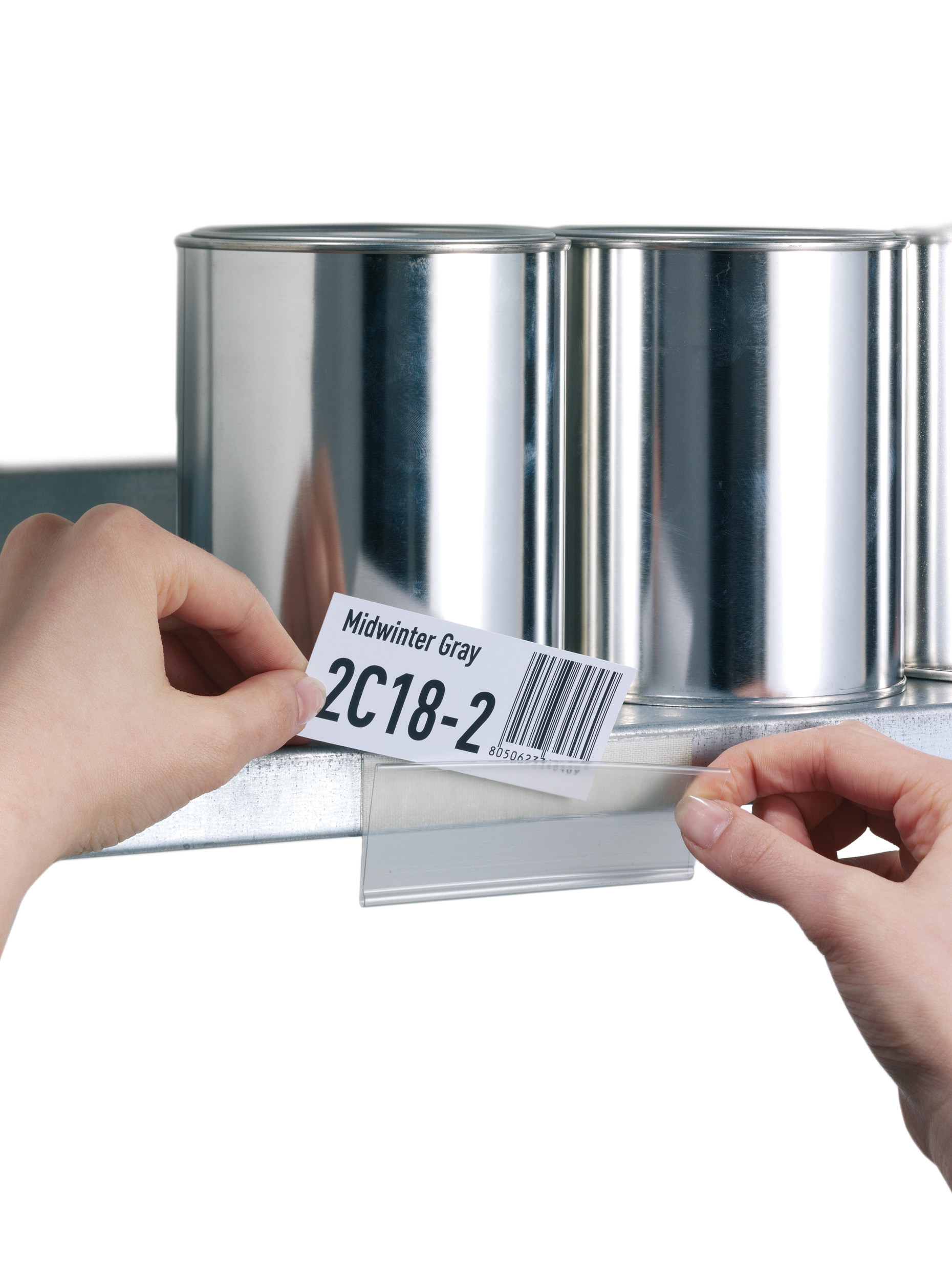 “SCANFIX® selvklæbende etiketholder til mærkning og scanning af f.eks. priser og stregkoder på hyldeforkanter, pallereoler og lagersystemer. Der medfølger hvide etiketter, og hyldeforkanten kan klippes til i den ønskede længde. Åben i toppen og siden, hvilket gør den velegnede til etiketter, der skal skiftes ofte. Gratis skabelon til at designe og udskrive stilfulde etiketter findes på www.duraprint.dk. Mål: 200 x 40 mm (BxH). Skrivehøjde 3,7 cm. Æske med 50 stk. Tilbehør: Ekstra etiketter på A5-ark til udskrivning i printere, art.nr. 809902.