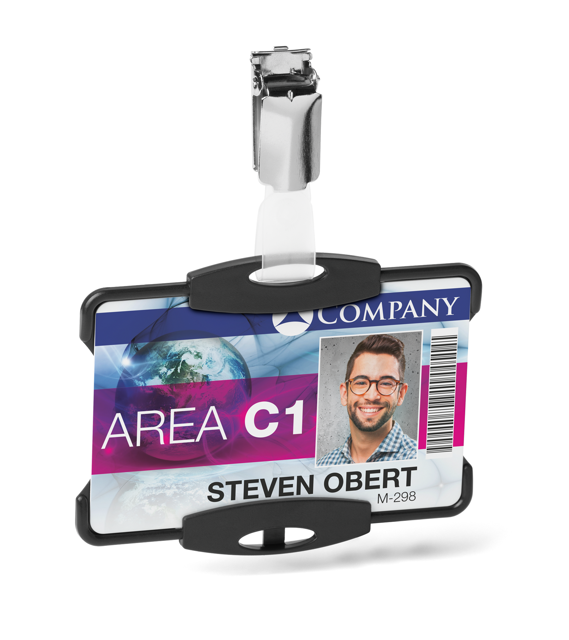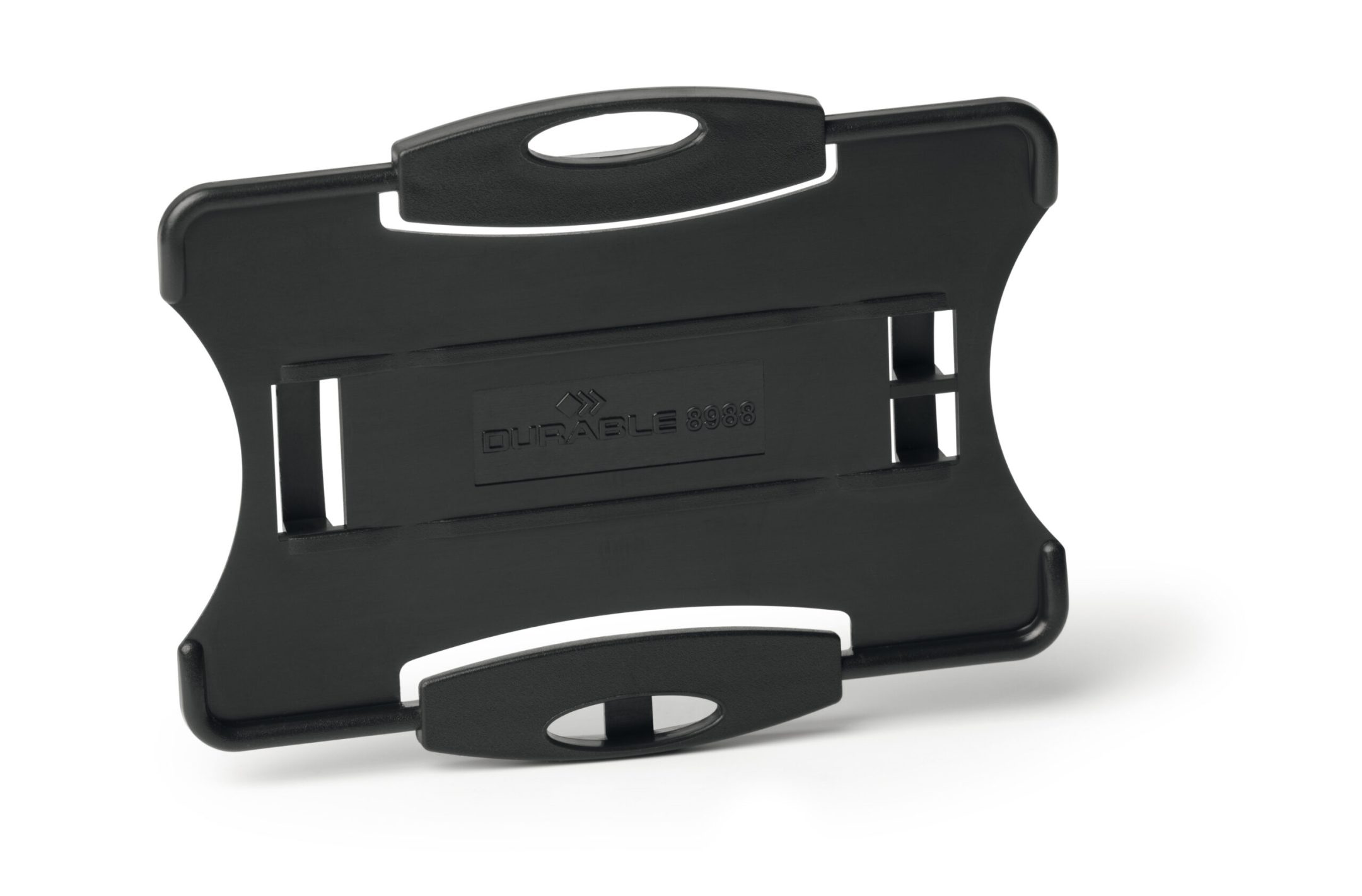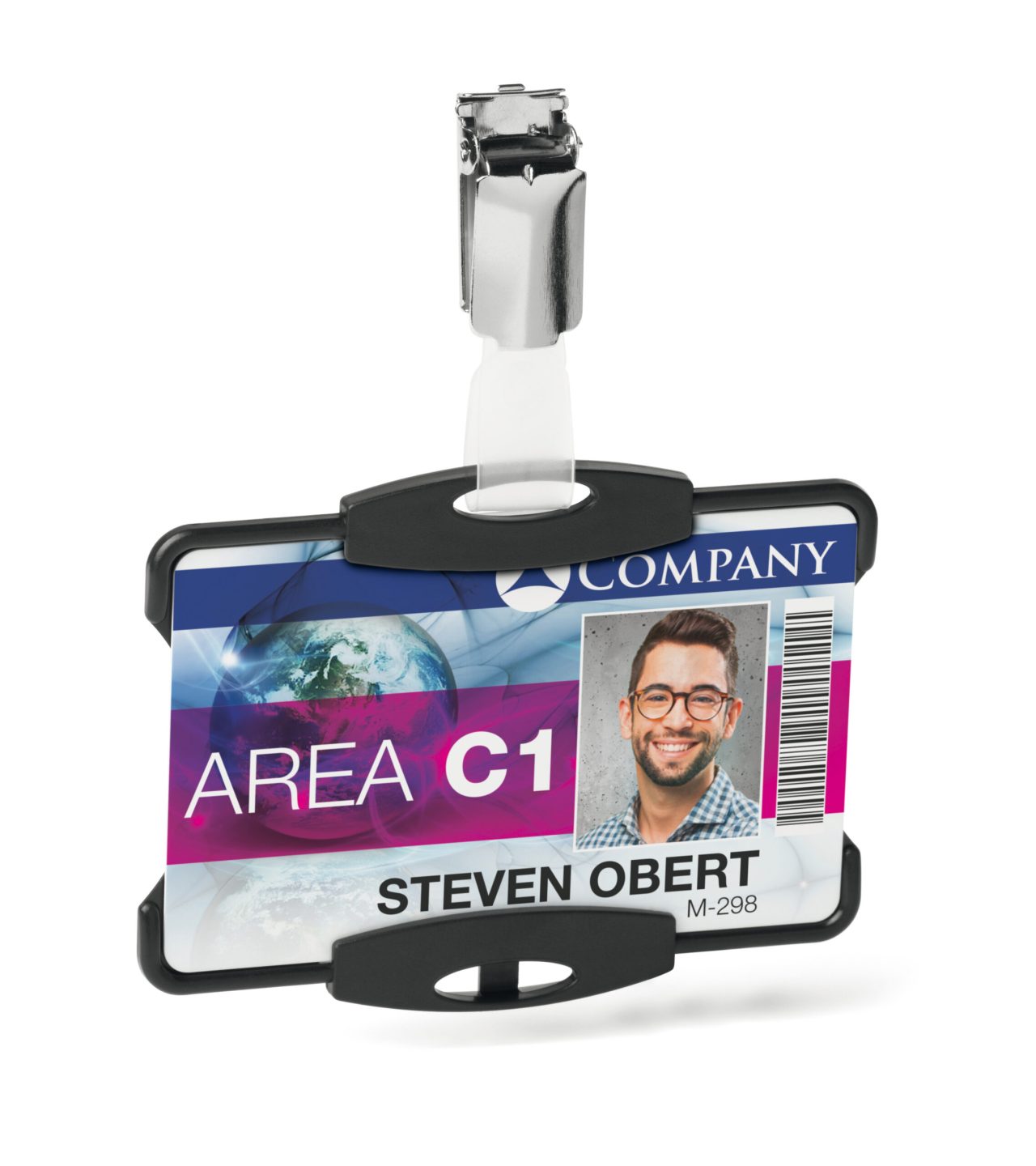 Åben kortholder til et ID- eller adgangskort – Fremstillet af genbrugsplast med Blue Angel certificering – Kan bruges i stående eller liggende format – Kan kombineres med halssnor, udtrækkelig yoyo-nøglering eller kæde