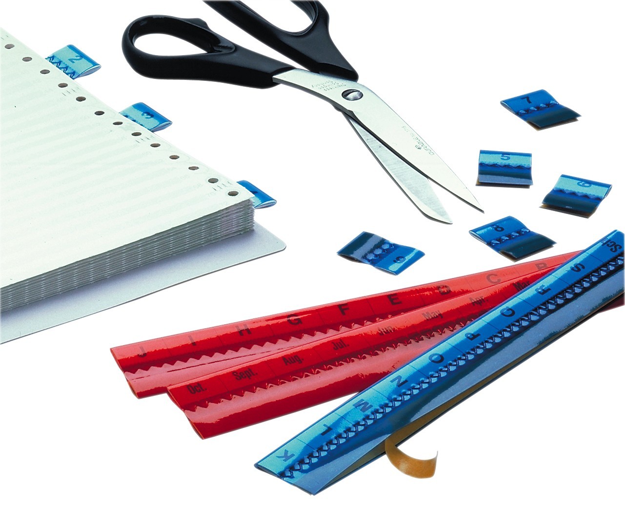 Selvklæbende faner Til overskuelig underinddeling og mærkning af kartoteker, projektsager, kataloger og hængemappestativer Bredde 200 mm, kan tilskæres individuelt Med blanke indstik og fortrykte indstik (AZ, 031, Jan.Dez. (tysk)), der er printet vandret og lodret