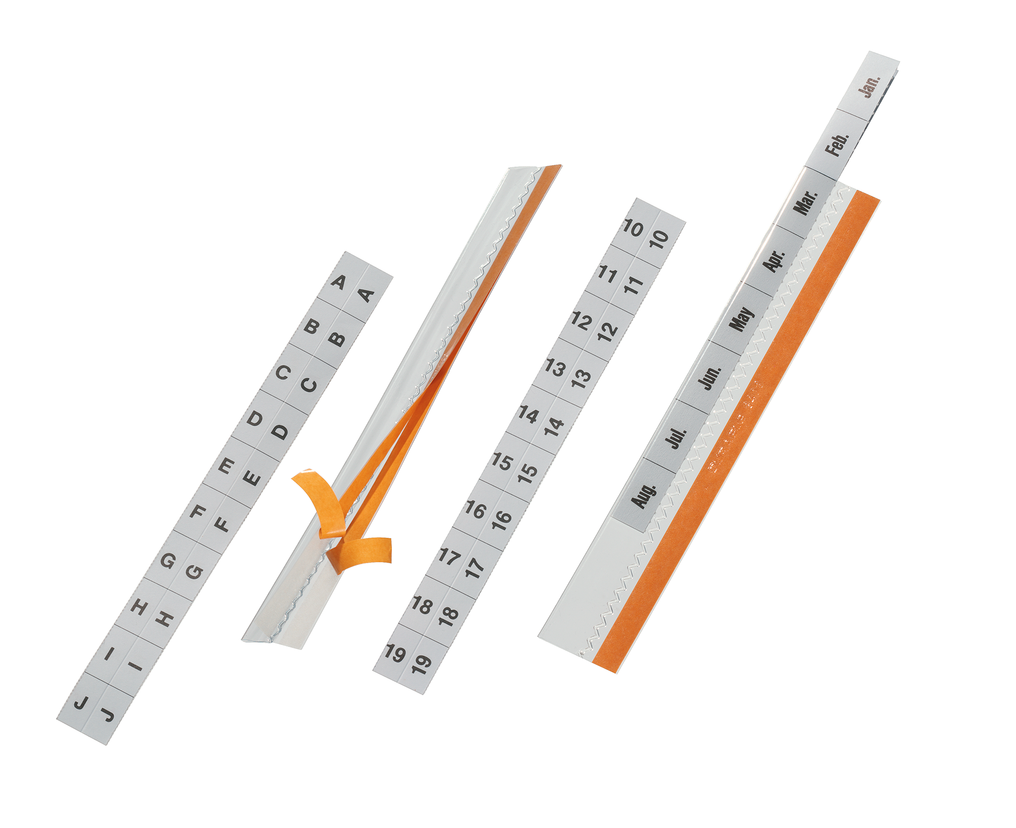 Selvklæbende faner Til overskuelig underinddeling og mærkning af kartoteker, projektsager, kataloger og hængemappestativer Bredde 200 mm, kan tilskæres individuelt Med blanke indstik og fortrykte indstik (AZ, 031, Jan.Dez. (tysk)), der er printet vandret og lodret