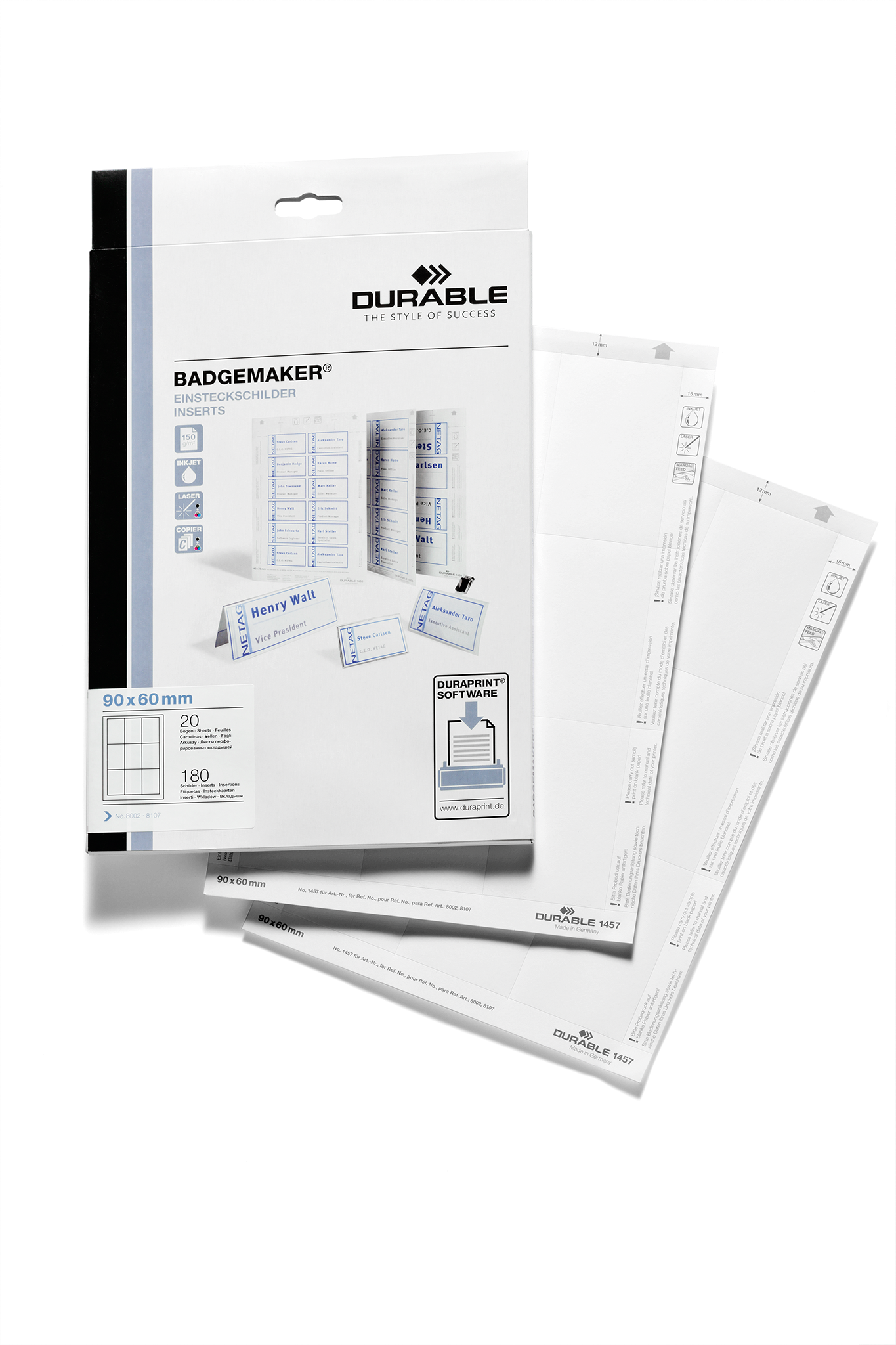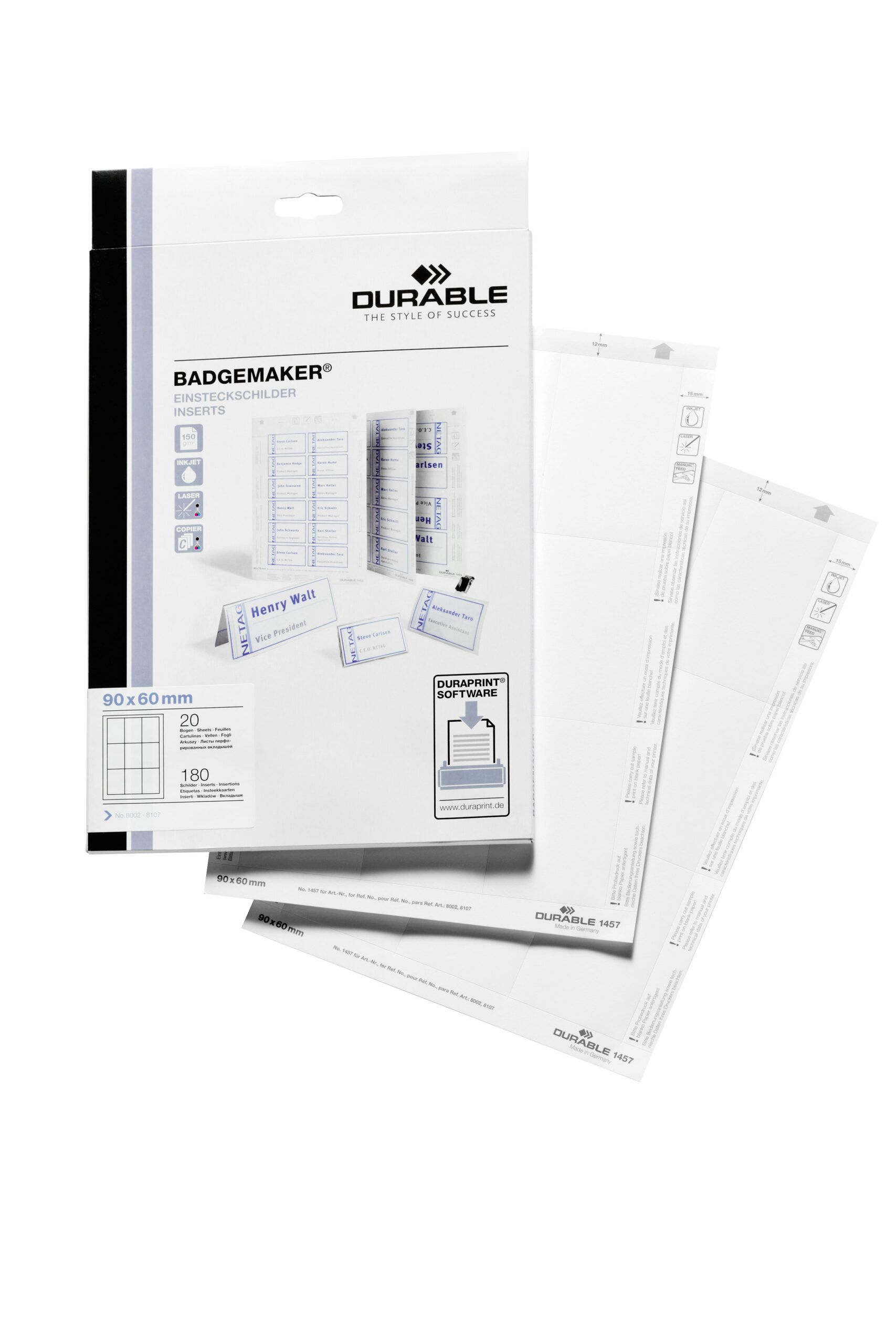 • Mikroperforerede indstik på A4-ark • Indeholder 180 indstik i størrelsen 90 x 60 mm • Til professionel udskrivning af navneskilte • BADGEMAKER®-indstik til bordnavneskilte kan også benyttes som bordkort • Til DURABLE artikelnr. 8002, 8107