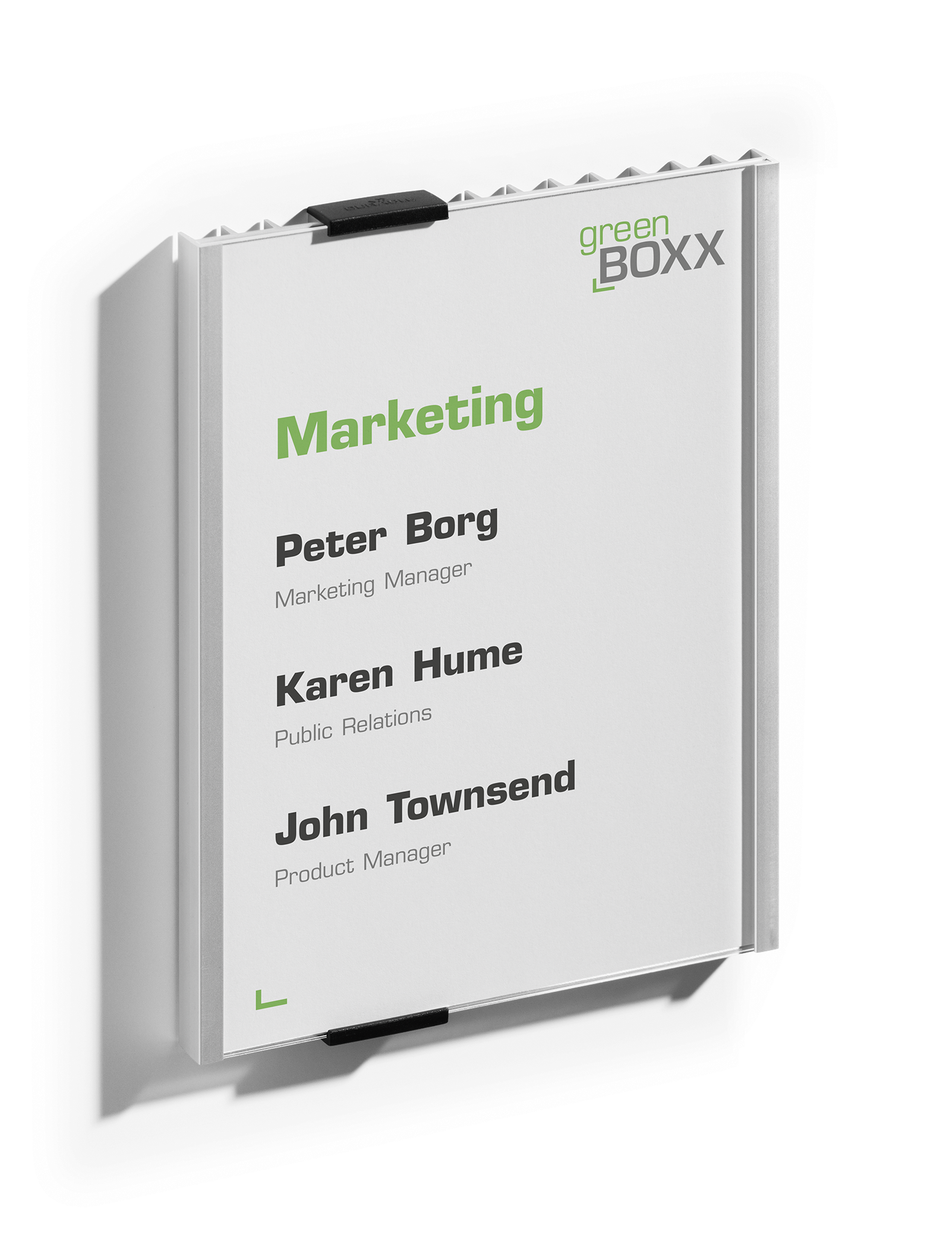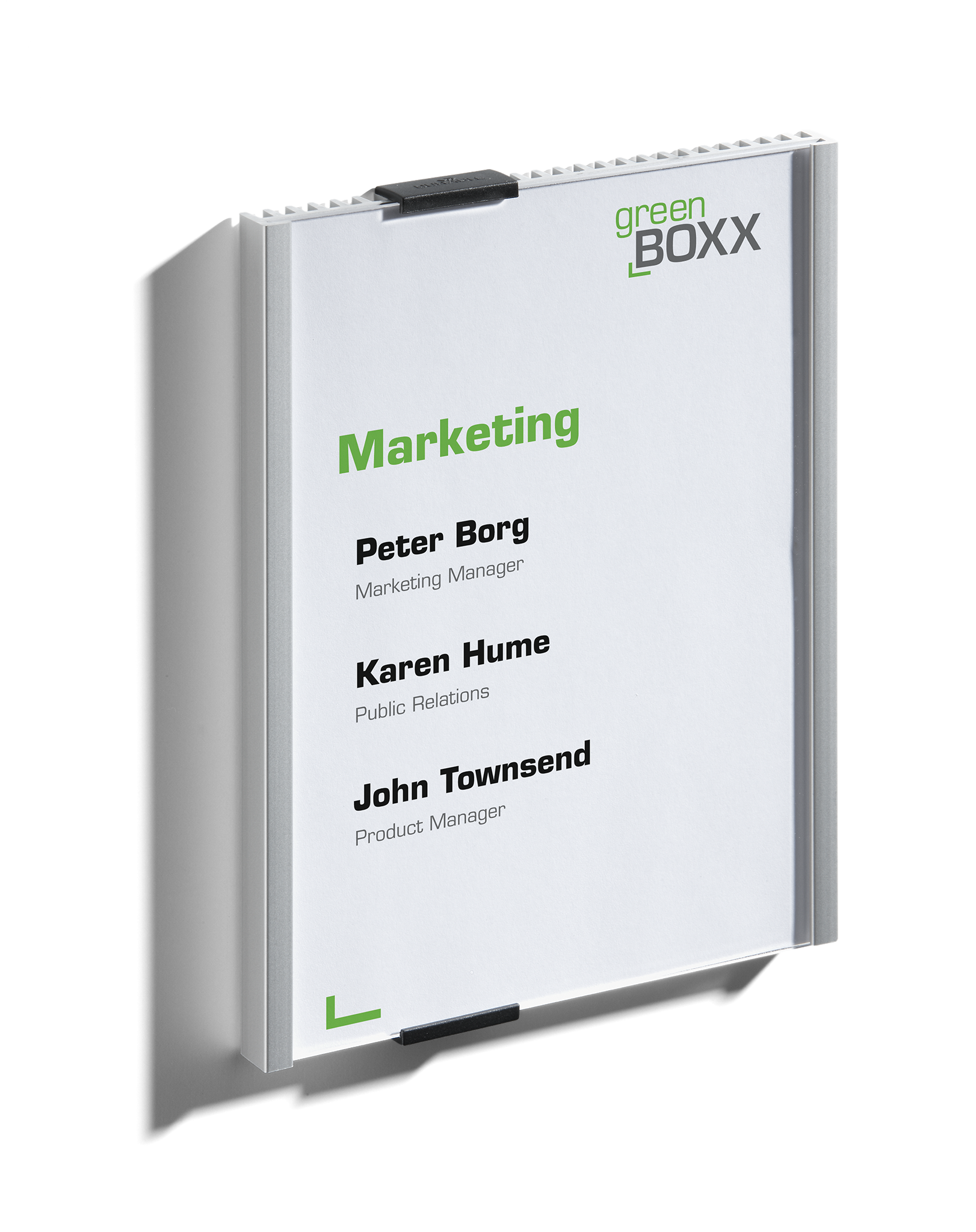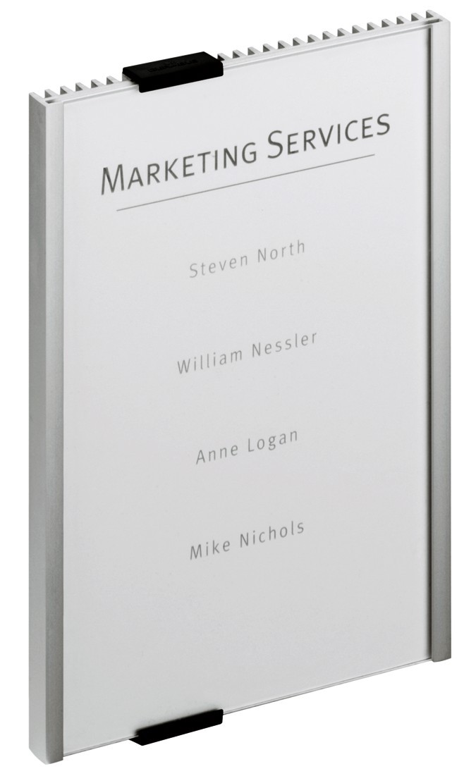 INFO SIGN er en serie i stilrent design som passer i de fleste miljøer. Med refleksfri frontplade i akryl. Leveres med skruer, klæbepuder og neutralt indstiksark. Ekstra indstiksark kan bestilles separat. Anvend DURAPRINT online som kan hjælpe med at fremstille en personlig designet indstiksetiket til skiltet, www.durable.dk.Dørskiltet er i aluminium 149 x 210mm A5 høj. Ekstra indstiksark kan bestilles separat (Durable art nr 485302)