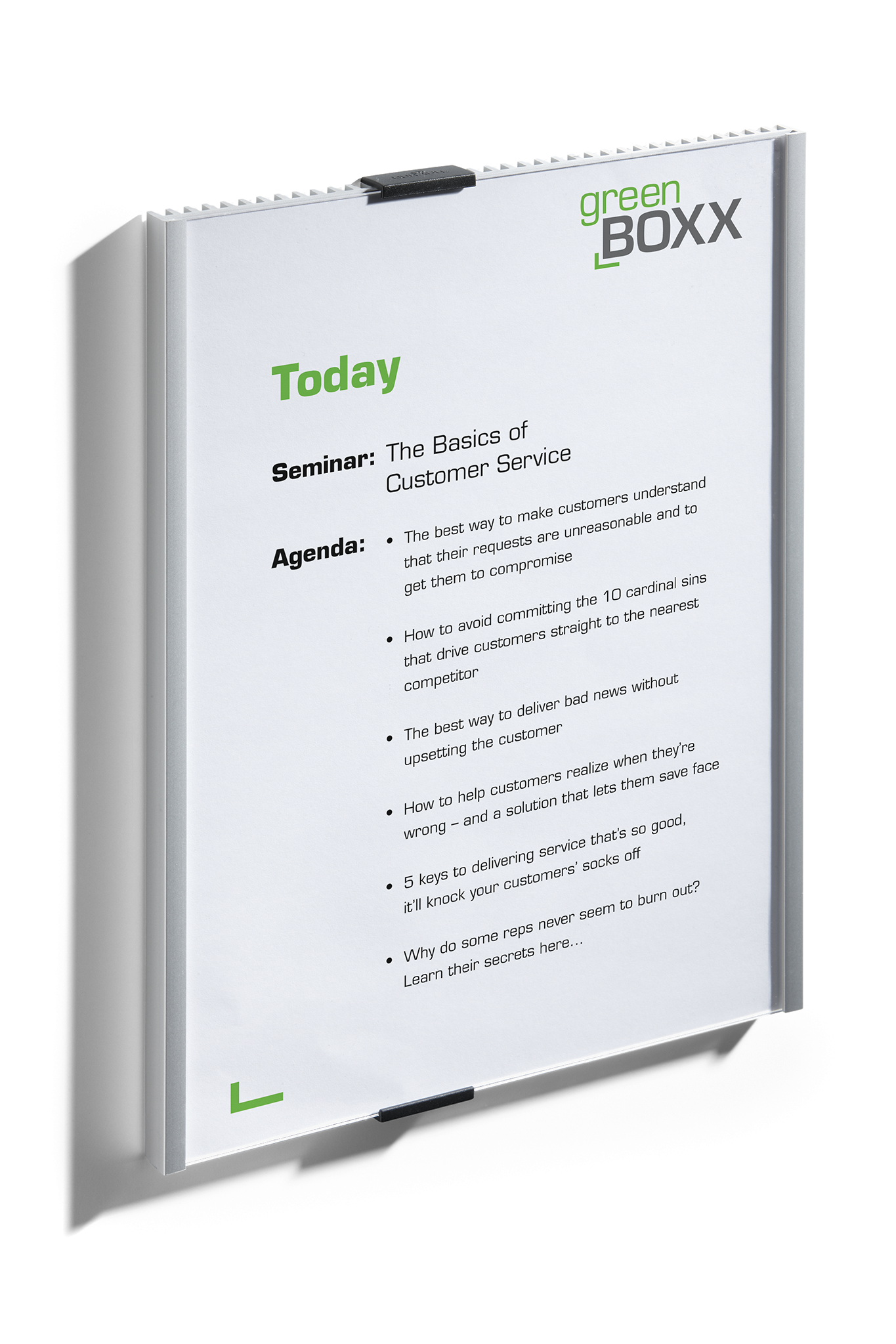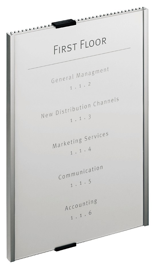 INFO SIGN er en serie i stilrent design som passer i de fleste miljøer. Med refleksfri frontplade i akryl. Leveres med skruer, klæbepuder og neutralt indstiksark. Ekstra indstiksark kan bestilles separat. Anvend DURAPRINT online som kan hjælpe med at fremstille en personlig designet indstiksetiket til skiltet, www.durable.dk.Dørskiltet er i aluminium i stående A4 format 210 x 297 mm. Ekstra indstiksark kan bestilles separat (Durable art nr 4856)