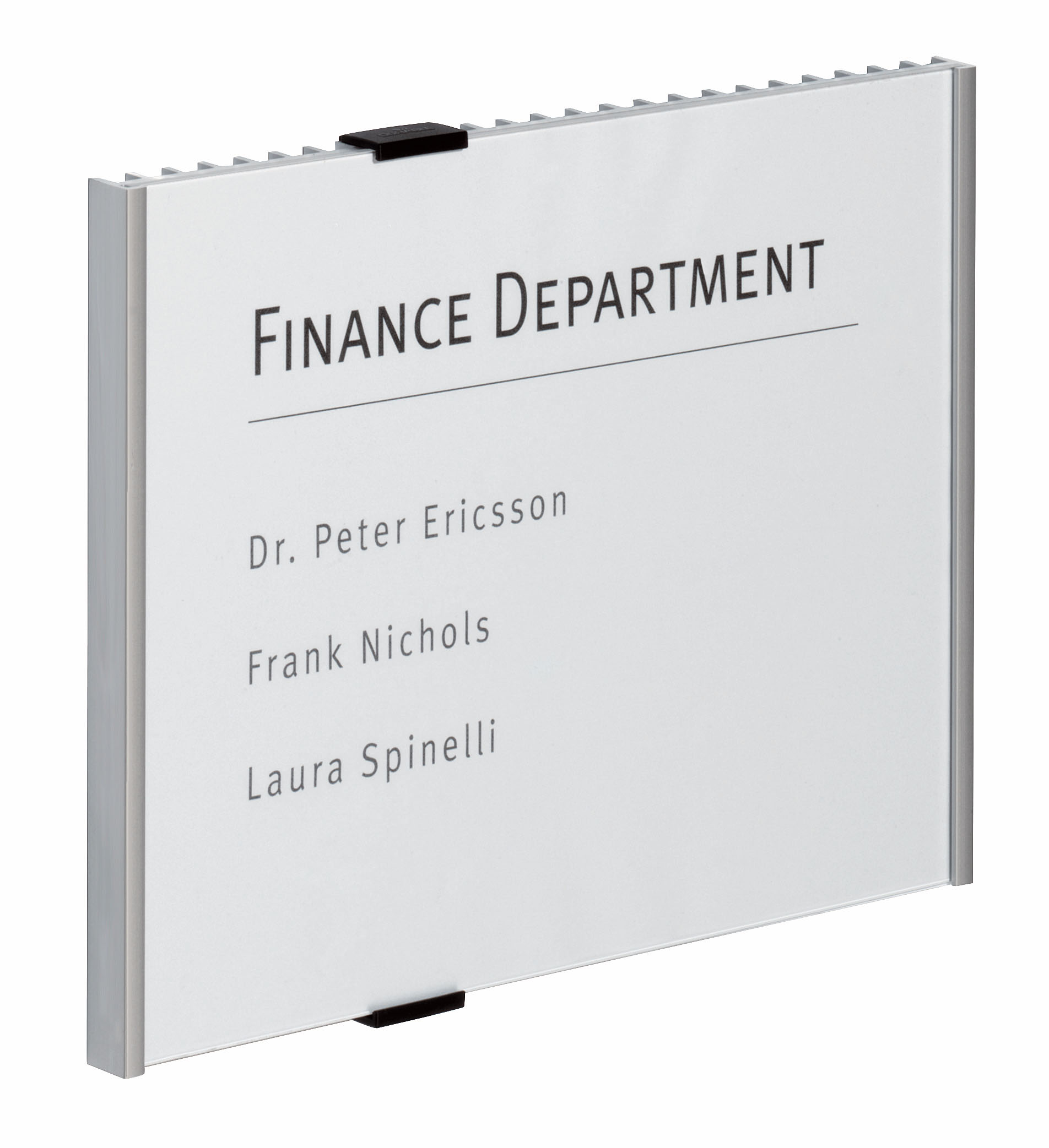 INFO SIGN er en serie i stilrent design som passer i de fleste miljøer. Dørskiltet er i aluminium med refleksfri frontplade i akryl. Leveres med skruer, klæbepuder og neutralt indstiksark. Ekstra indstiksark kan bestilles separat (varenr.. 4856). Design selv en personlig designet indstiksetiket til skiltet med gratis skabelon på www.duraprint.dk Mål: 297x210mm A4 tvær.