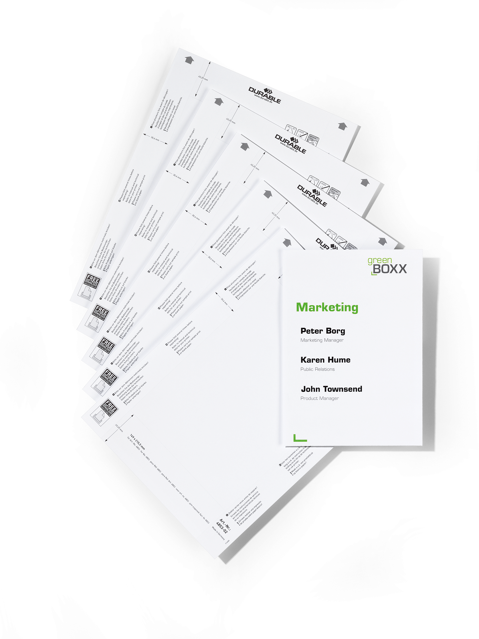 hvid indstik på A4-ark til Durable dør/vægskilte INFO SIGN og CLICK SIGN. Passer til varenr. 480319. En pakke giver 10 skilte. Design selv en personlig designet indstiksetiket til skiltet med gratis skabelon på www.duraprint.dk