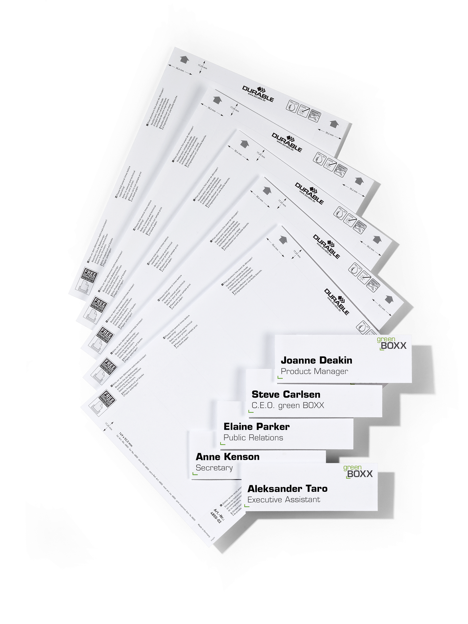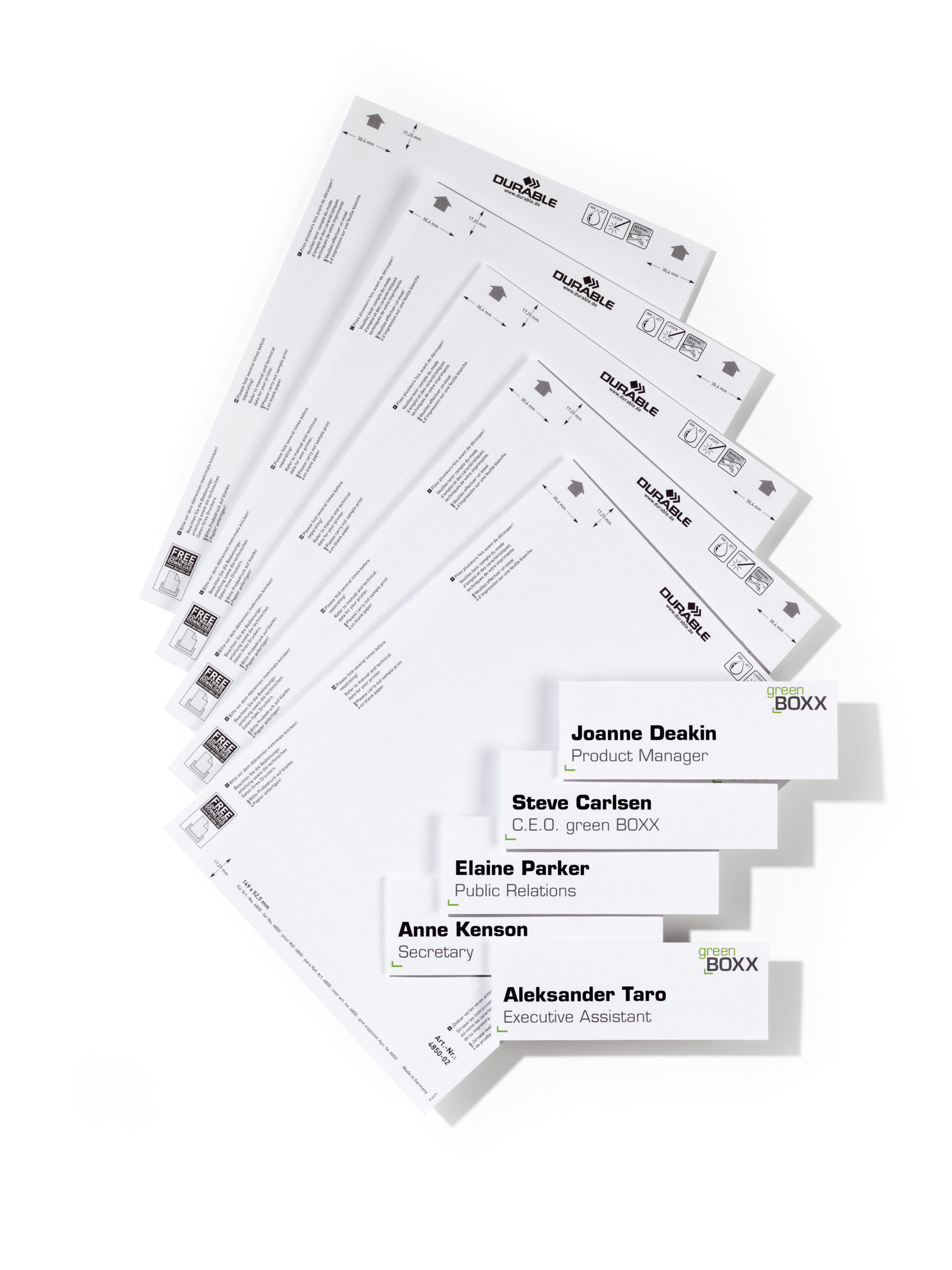 hvid indstik på A4-ark til Durable dør/vægskilte INFO SIGN og CLICK SIGN. Passer til Durable art nr 480019 og 4860 i forskellige farver. En pakke giver 50 skilte. Design selv en personlig designet indstiksetiket til skiltet med gratis skabelon på www.duraprint.dk
