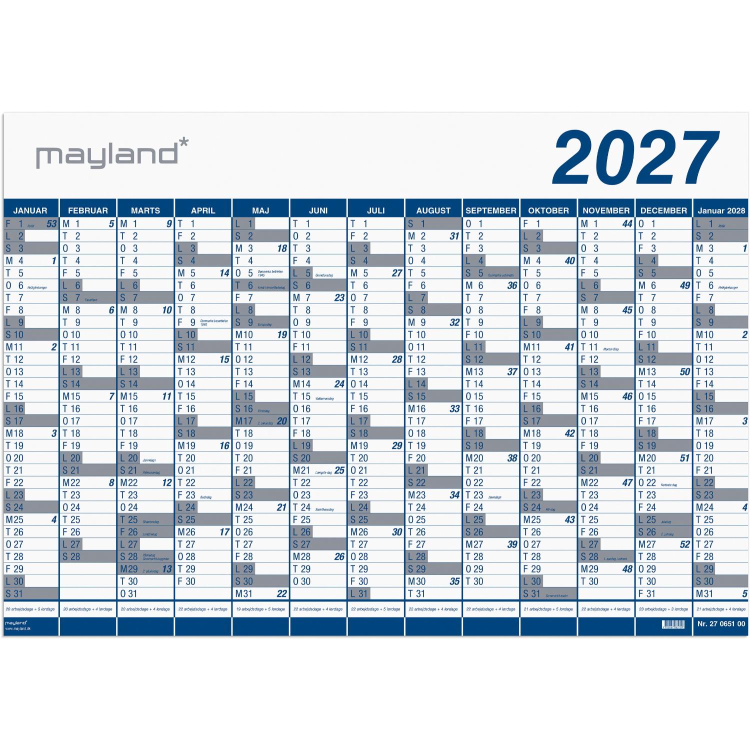 Mål: 740 x 72 x 72 mm. Layout: Dag/side. Højformat. Kalendarium: 2027-01-01 – 2028-01-31. Sideantal: 2. Varemærke: Mayland.