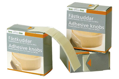 Æske med 100 stk. dobbeltklæbende klæbepuder. Klæbepuderne er på 25 x 12 mm og 1 mm tykke.