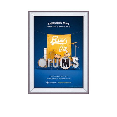 Sølvfarvet klapramme med antirefleks frontplade, der gør det nemt at læse indholdet, selv i direkte sollys.