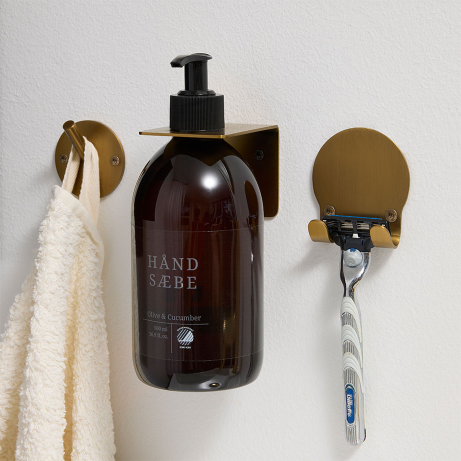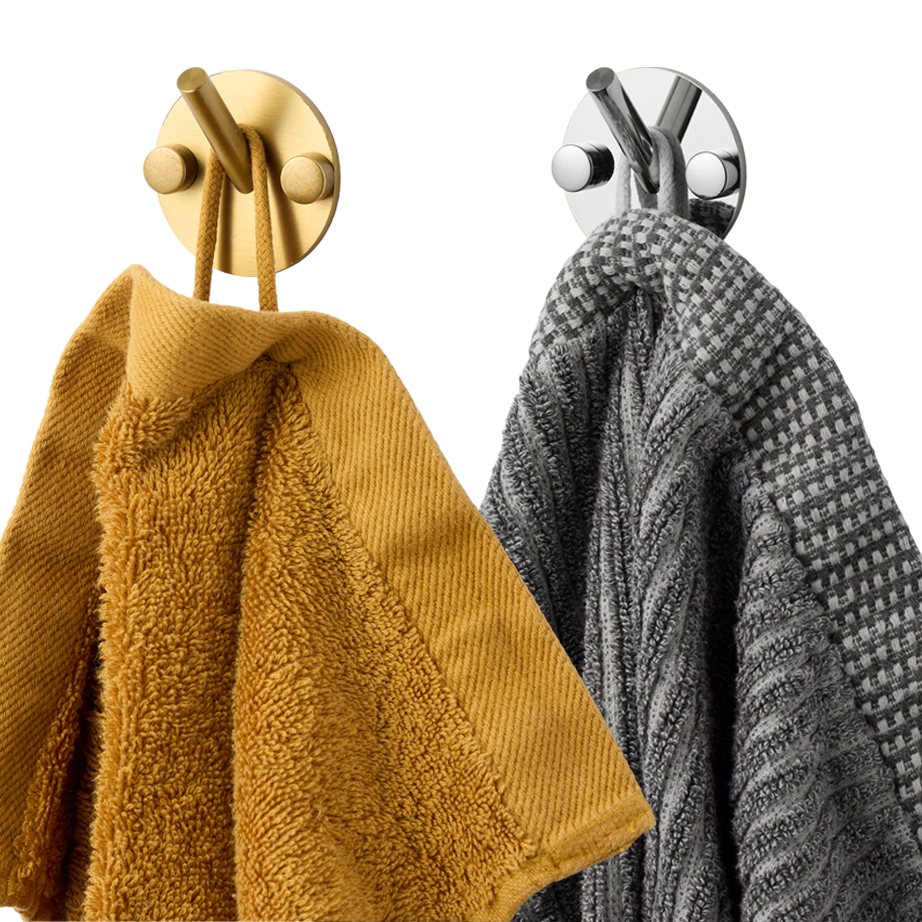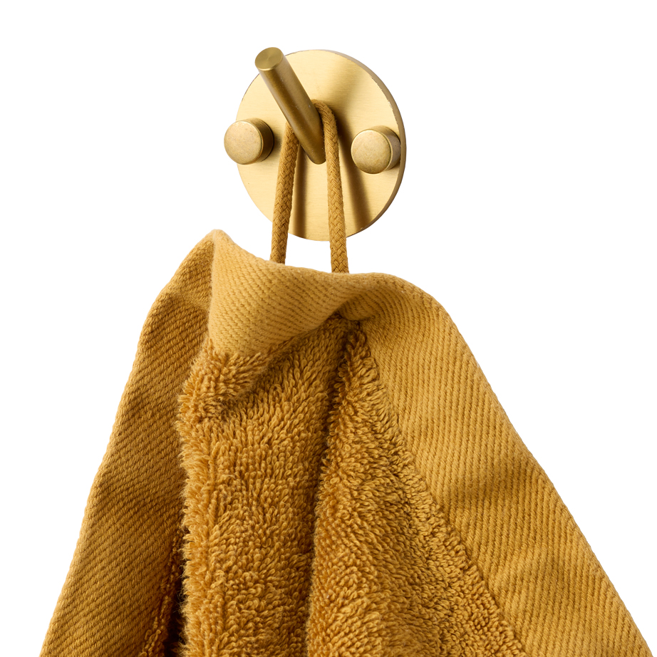 Håndklædekrog i messinglookDenne håndklædekrog er ideel til ophæng af alt fra håndklæder og badehåndklæder på badeværelset til viskestykker og grydelapper i køkkenet. Håndklædekrogen er lavet af rustfrit stål og har en børstet finish i messinglook.Håndklædekrogen monteres nemt på væggen med enten dobbeltklæbende tape eller skruer (begge dele medfølger). Du kan desuden skjule skruerne med de medfølgende dækpropper. Vælger du den skruefri løsning, er det vigtigt at rengøre overfladen grundigt, fjerne beskyttelsesfilmen og trykke krogen fast i mindst 30 sekunder.Kombiner håndklædekrogen med matchende badeværelsestilbehør i rustfrit stål fra NAGA.Diameter 5 cm.