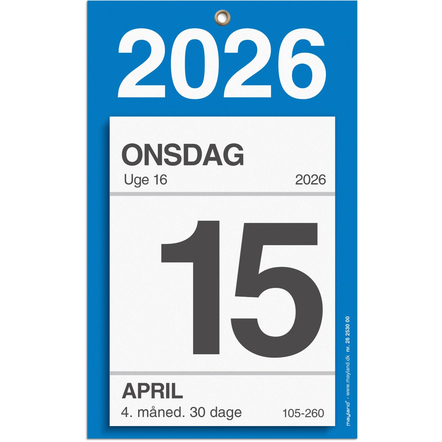 Afrivningskalender til vægophæng. Den smarte vægkalender har et praktisk blokformat, hvor hver side nemt kan rives af blokken, når dagen er gået. Afrivningskalenderen har et enkelt og moderne design med en blå baggrund og har bagsidetekster og et ugentligt krydsord.