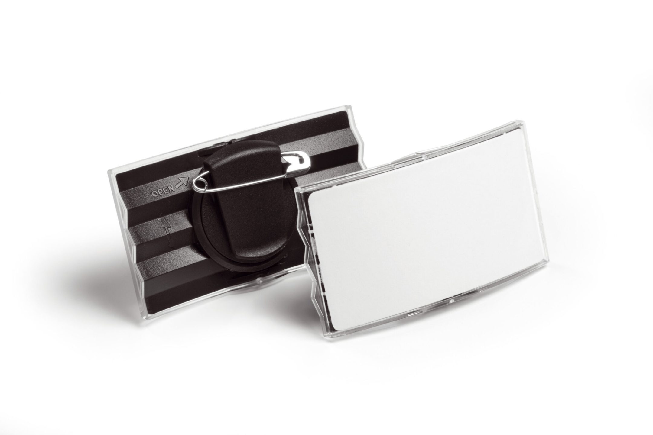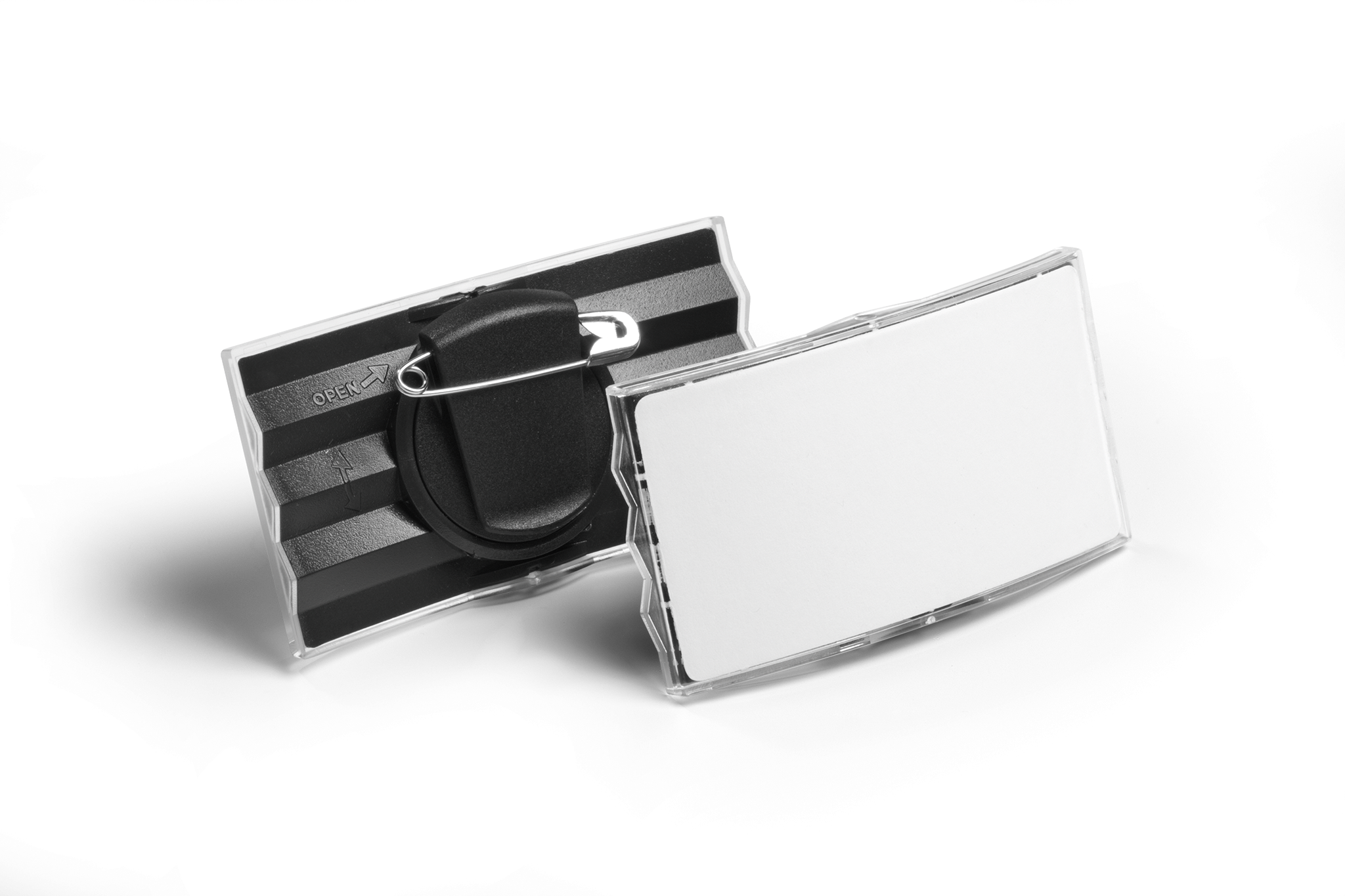 Let konveks navneskilt af akryl med drejelig plastklemme med nål giver valgmulighed for at fastsætte på tøjet i høj eller tværformat. Konveks overflade ger optimal læsbarhed. Indstik medfølger. Mål indstik: 40x75mm (HxB). Indstiksetiket på A4 ark til udskrivning i printer kan bestilles separat (varenr. 145302). Design selv en personlig designet kongressmærke med gratis skabelon på www.duraprint.dk