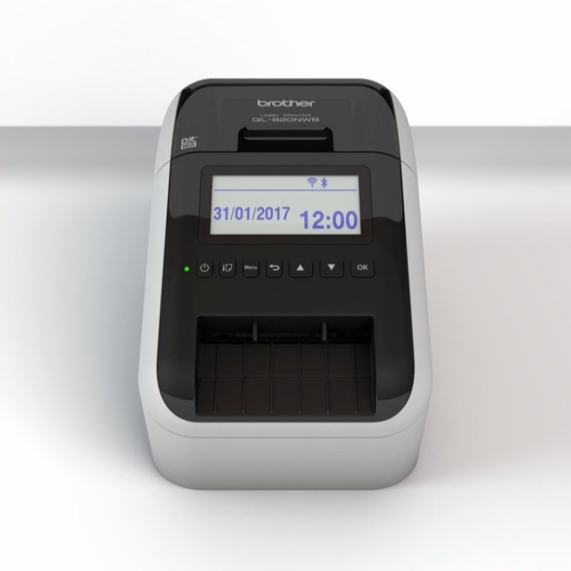 Leveres med en AC-adapter + netledning, USB-kabel og 29 mm x 90 mm sort print på hvide standardadresseetiketter (100 etiketter) – 62 mm sort/rød print på papirbånd i kontinuerlig længde (5 meter)