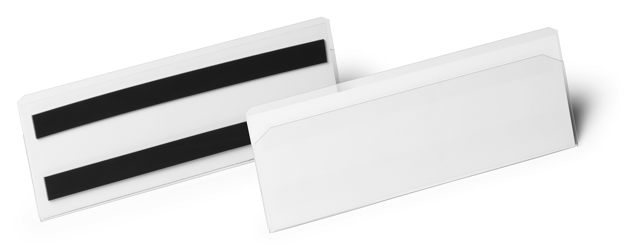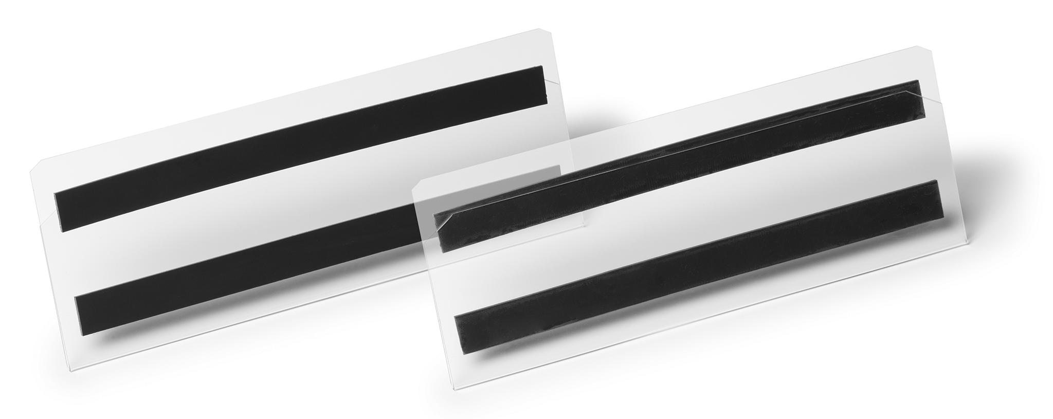 Klar og tydelig mærkning af butiks- og lagerreoler, skabe, døre, containere i metal forbedrer og strømliner arbejdsprocessen på lager- og produktionsfaciliteter. De transparente, magnetiske etiketholdere af kraftig PET-plast kan læses med en scanner. Lagerlomme/Etiketholdere er nemme at udskifte, da lommerne er åbne i toppen og på begge sider og desuden har skrå hjørner, så det er nemt at få adgang til etiketten. To magnetstrips på bagsiden sikrer, at lommen sidder fast på plads. Hver etiketholder er dækket af en gennemsigtig plastfilm, der beskytter mod ridser under transport og opbevaring. Beskyttelsesfilmen fjernes nemt, når produktet er klar til brug. Der findes en gratis skabelon til etiketten på www.duraprint.dk. Indvendige mål: 1/2 A5 landskab (210 x 74 mm) (B x H) Ydre mål: 213 x 79 mm (B x H) Tilbehør: Etiketter på A4-ark, art. nr. 102802