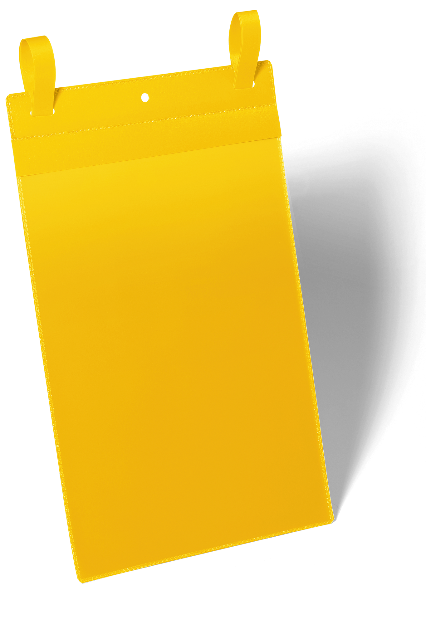 Lagerlomme med pile formede stropper, der fastgøres gennem slidsen i lommen. Ideel til permanent brug på lageret. farvet bagside og gennemsigtigt vindue lavet af heavy-duty polypropylen. Velegnet til udendørs brug takket være åbning med en beskyttende foldefane i toppen der beskytter dokumenter fra støv og fugt. Rivefast og velegnet til scannere. Indhold kan udskiftes hurtigt. Gratis skabeloner til etiketter fås fra www.duraprint.dk Indvendige mål: A4 høj (B x H) Udvendige mål: 223×530 mm (B x H)