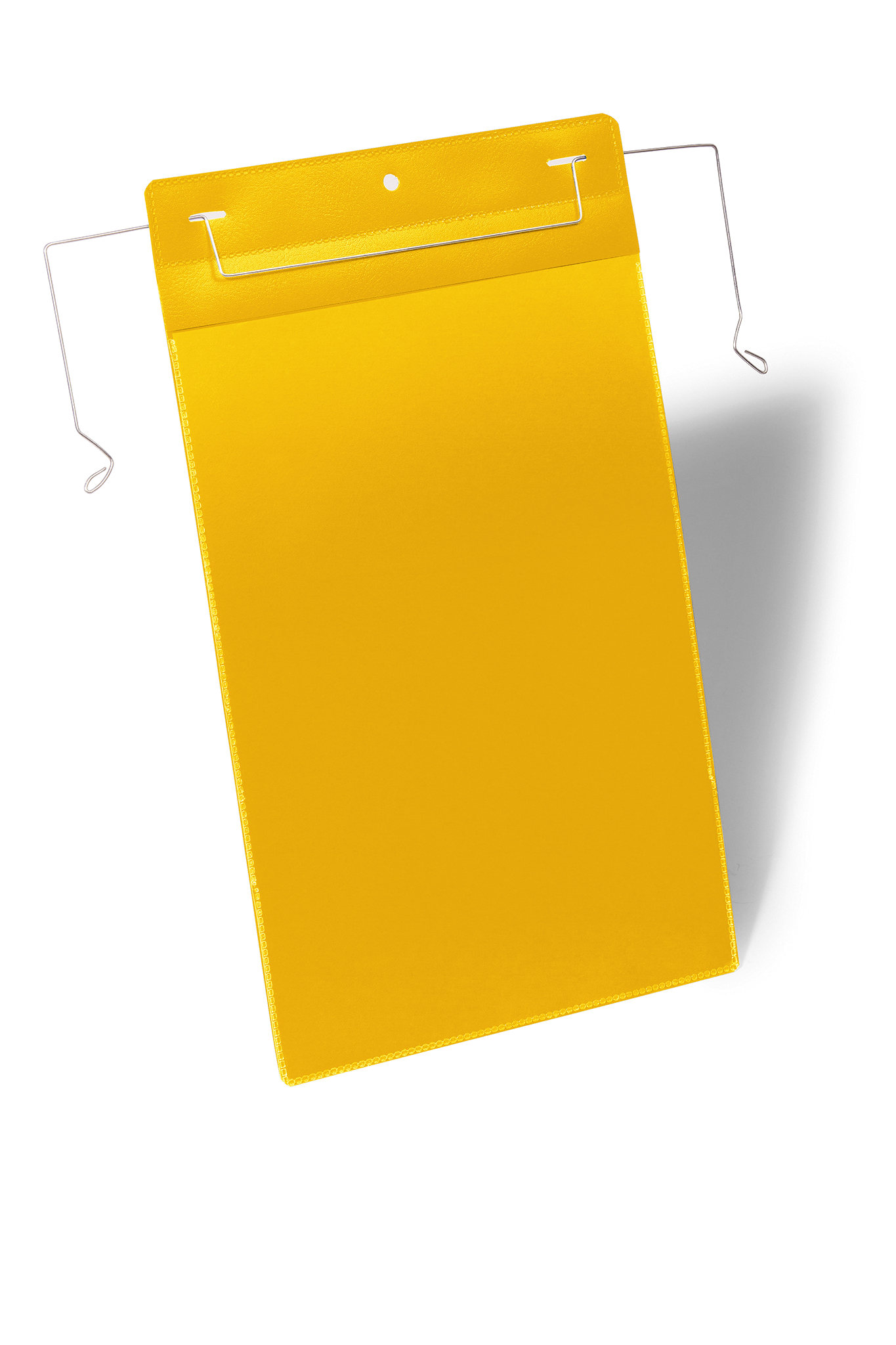 Lagerlomme med galvaniseret, bøjelig wirebeslag til nem og sikker fiksering. farvet bagside og gennemsigtigt vindue lavet af heavy-duty polypropylen. Brug på containere, pallerammer og paller bokse. Velegnet til udendørs brug takket være åbning med en beskyttende foldefane i toppen der beskytter dokumenter fra støv og fugt. Rivefast og velegnet til scannere. Indhold kan udskiftes hurtigt. Gratis skabeloner til etiketter fås fra www.duraprint.dk Indvendige mål: A4 høj (B x H) Udvendige mål: 223×368 mm (B x H)