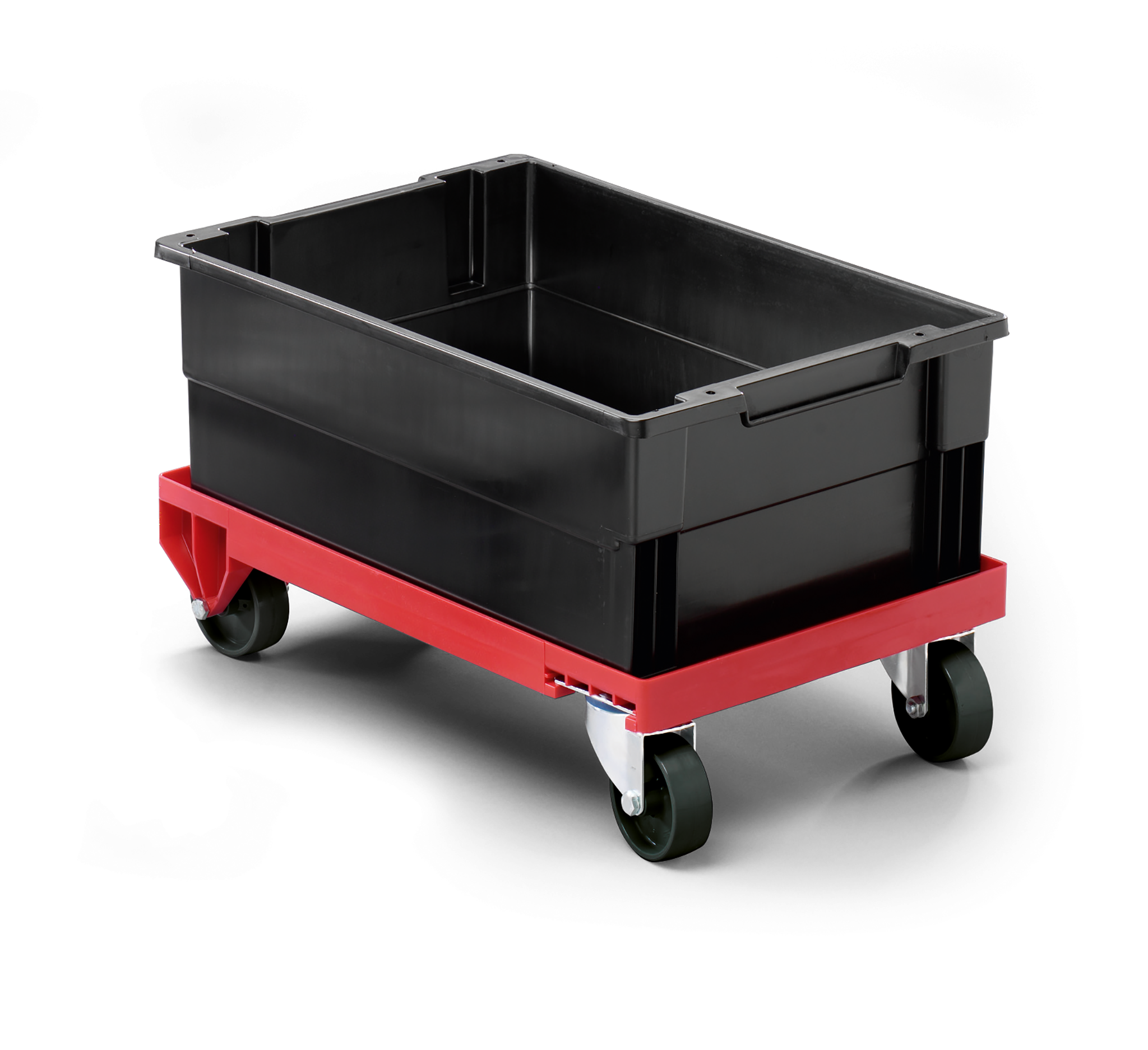 Lagervogn i kraftig plast med svingbare hjul. Til transport af lagerkasser og mindre gods. Laste kapacitet op til 250 kg. Mål: 400x160x600 mm (BxHxD)