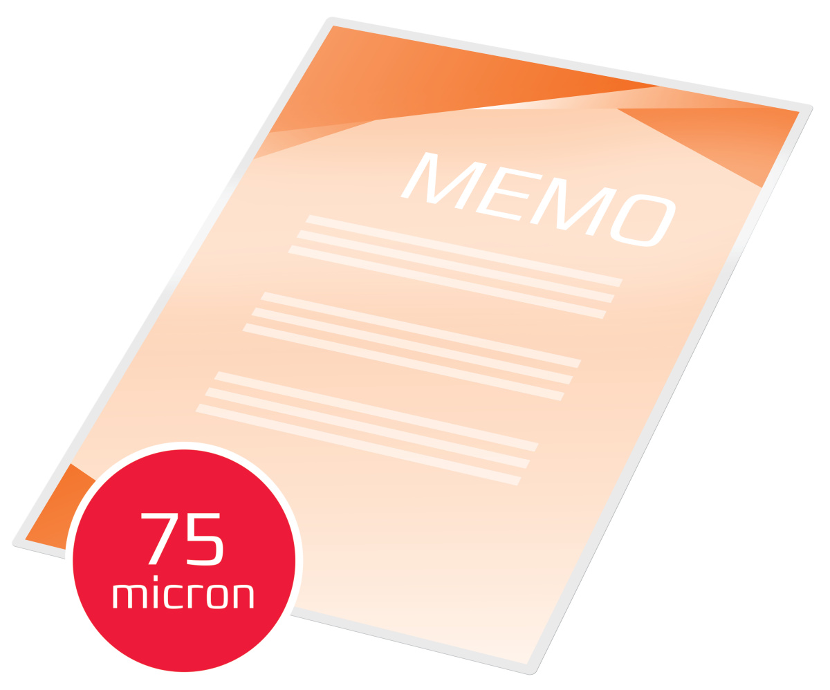 Lamineringslomme i A5 format med en tykkelse på 75 micron. 100 micron svarer til 0.1 mm.