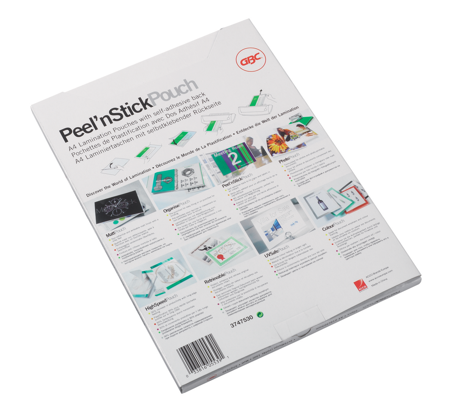 En tilbehørsserie lavet til perfekt personliggørelse af dine laminerede dokumenter. GBC selvklæbende lamineringslomme A4 125 micron skinnende (100)