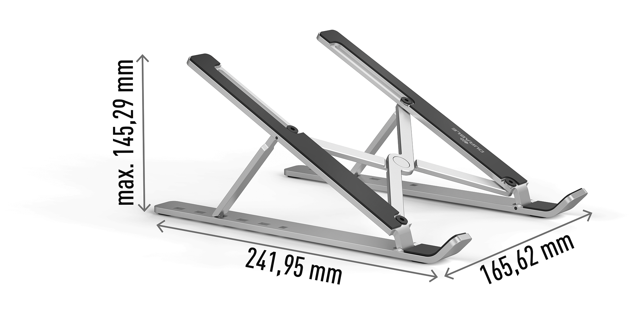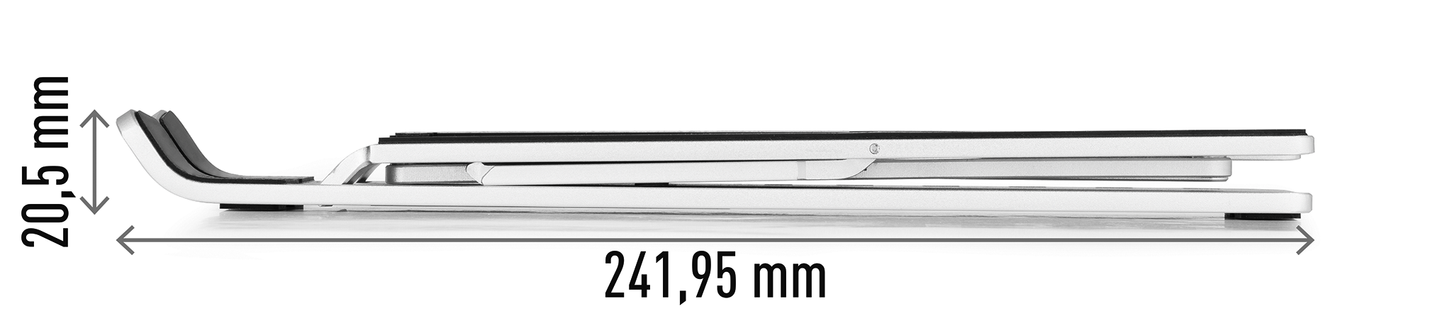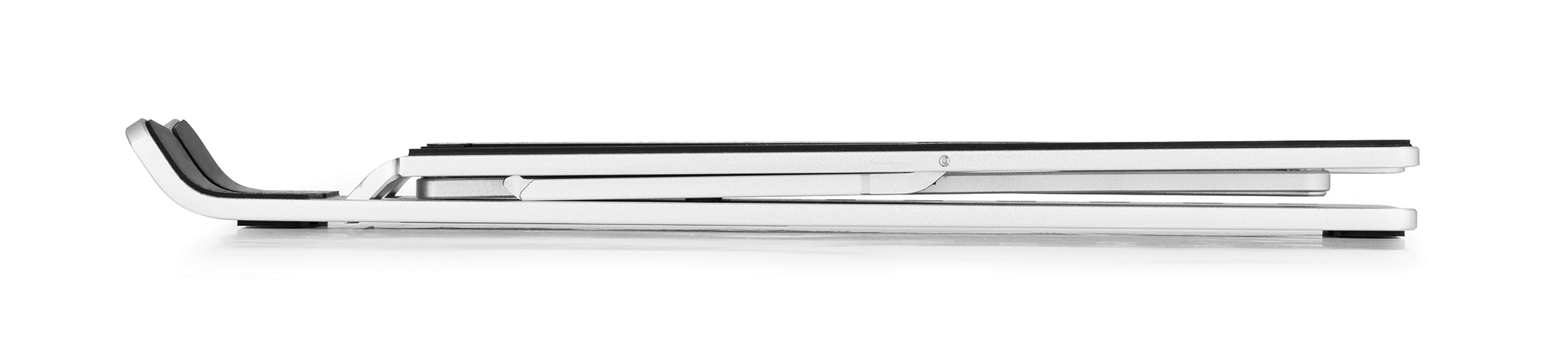 For dem, der bruger deres bærbare computer eller tablet som skærm, er det let at komme i en dårlig ergonomisk stilling fx ved at de krummer ryggen. Alternativt har de stablet bøger eller andre ting under den bærbare computer for at bringe skærmen op i øjenhøjde Laptop Stand FOLD er et foldbart bordstativ, der passer til bærbare computere og tablets på op til 5 kg og i størrelsen 10″-15″. Justerbar højde og læsevinkel i 6 faste trin. Tilføj et eksternt tastatur og trådløs mus for at opnå en mere ergonomisk arbejdsstilling. Fremstillet af op til 40 % genanvendt 2,5 mm tykt aluminium. 100% genanvendelig. Gummiunderlag og stopkant forhindrer computeren i at glide ud af stativet. Gummipuder på undersiden beskytter også skrivebordsoverfladen mod ridser og holder stativet stabilt. Luften kan cirkulere frit på bagsiden, hvilket mindsker risikoen for overophedning. Praktisk lille stofpose medfølger, så den er nem at tage med dig, stativet vejer kun 267 g. Mål sammenfoldet: H 21 x B 40 x D 242 mm