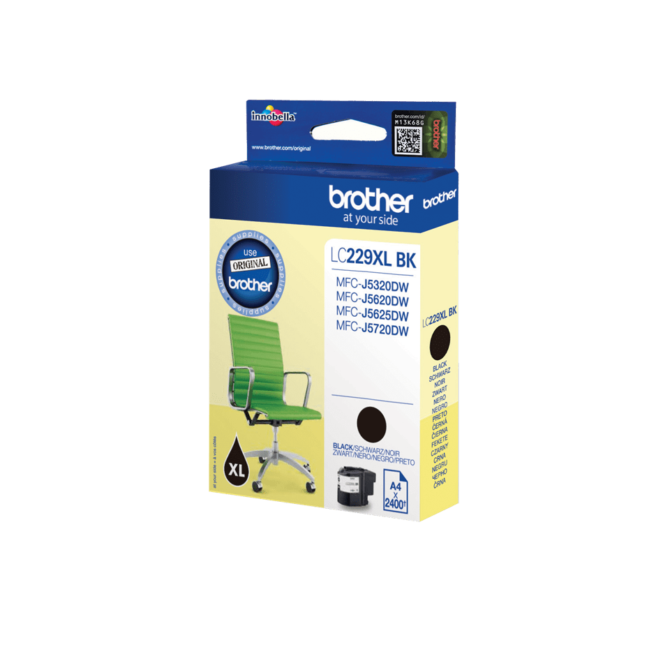 Brother LC229XLBK. Forsyningstype: Enkelt pakke, Udskrivning af farver: Sort, Antal pr. pakke: 1 stk, Sort blæk sidekapacitet: 2400 Sider