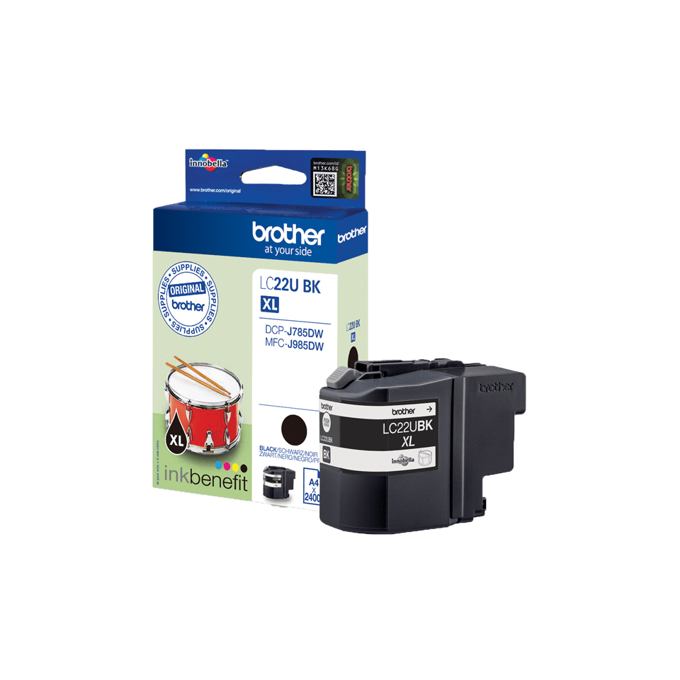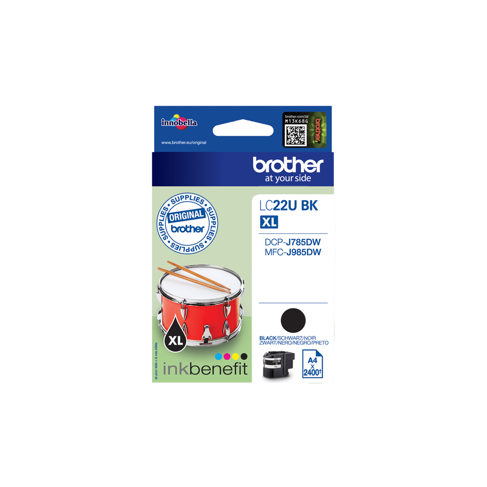 Brother LC22UBK. Forsyningstype: Enkelt pakke, Udskrivning af farver: Sort, Antal pr. pakke: 1 stk, Sort blæk sidekapacitet: 2400 Sider