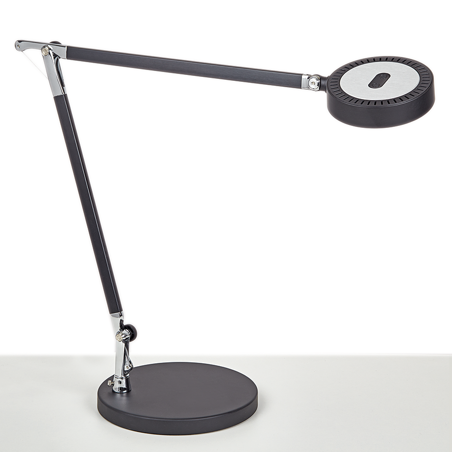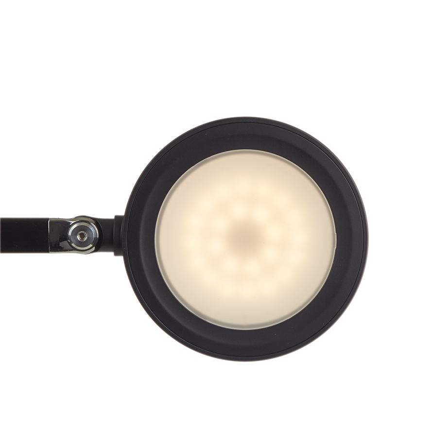 Moderne, sort LED skrivebordlampe fra MAUL Denne moderne skrivebordslampe er perfekt til at belyse selv de større skriveborde på kontoret. Lampen har 3 lysindstillinger: varmt, koldt og neutralt lys, så du kan vælge efter personlig præference. Skift nemt mellem indstillingerne med et enkelt tryk på knapperne, som er placeret på lampehovedet. Med den nyeste LED-teknologi sikrer lampen en høj energieffektivitet og et minimalt strømforbrug. 618 Lumen, 6kWh/1000h. Lampen er fremstillet i sort aluminium med en justerbar arm og et roterbart lampehoved. Ekstra vægt i lampefoden sikrer, at lampen står stabilt på skrivebordet. Alle kontorlamper fra MAUL er designet til at kunne repareres og genanvendes fremfor at blive kasseret. Derfor har alle lamperne udskiftelige lyskilder og betjeningsenheder. Emballagen er genanvendelig. Dette produkt har 2 års garanti. Højde 46,6 cm. Lampehoved Ø 11,6 cm. Øverste og nederste arm 36,5 cm. hver. Bund Ø 20,5 cm. Ledning 2 m.