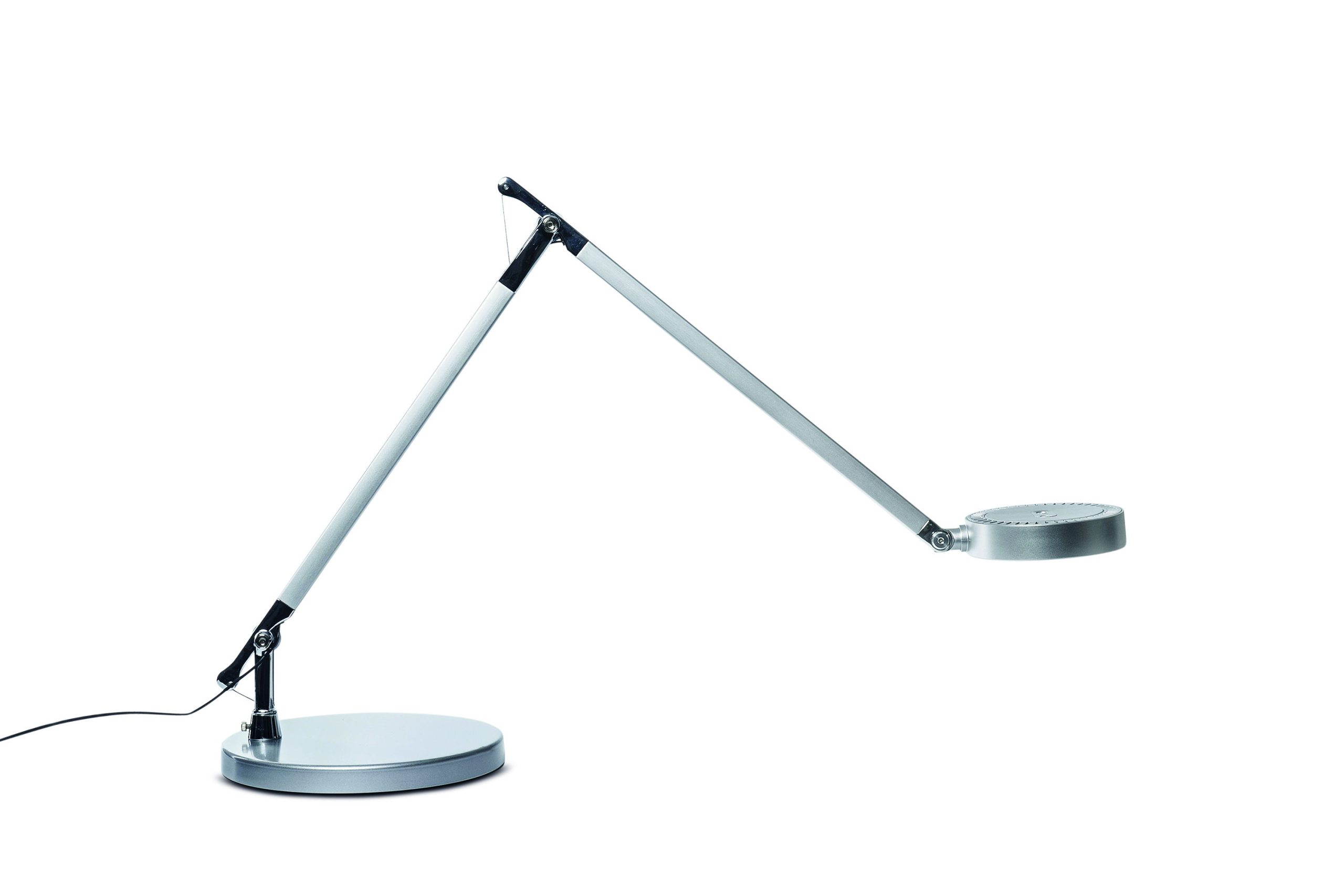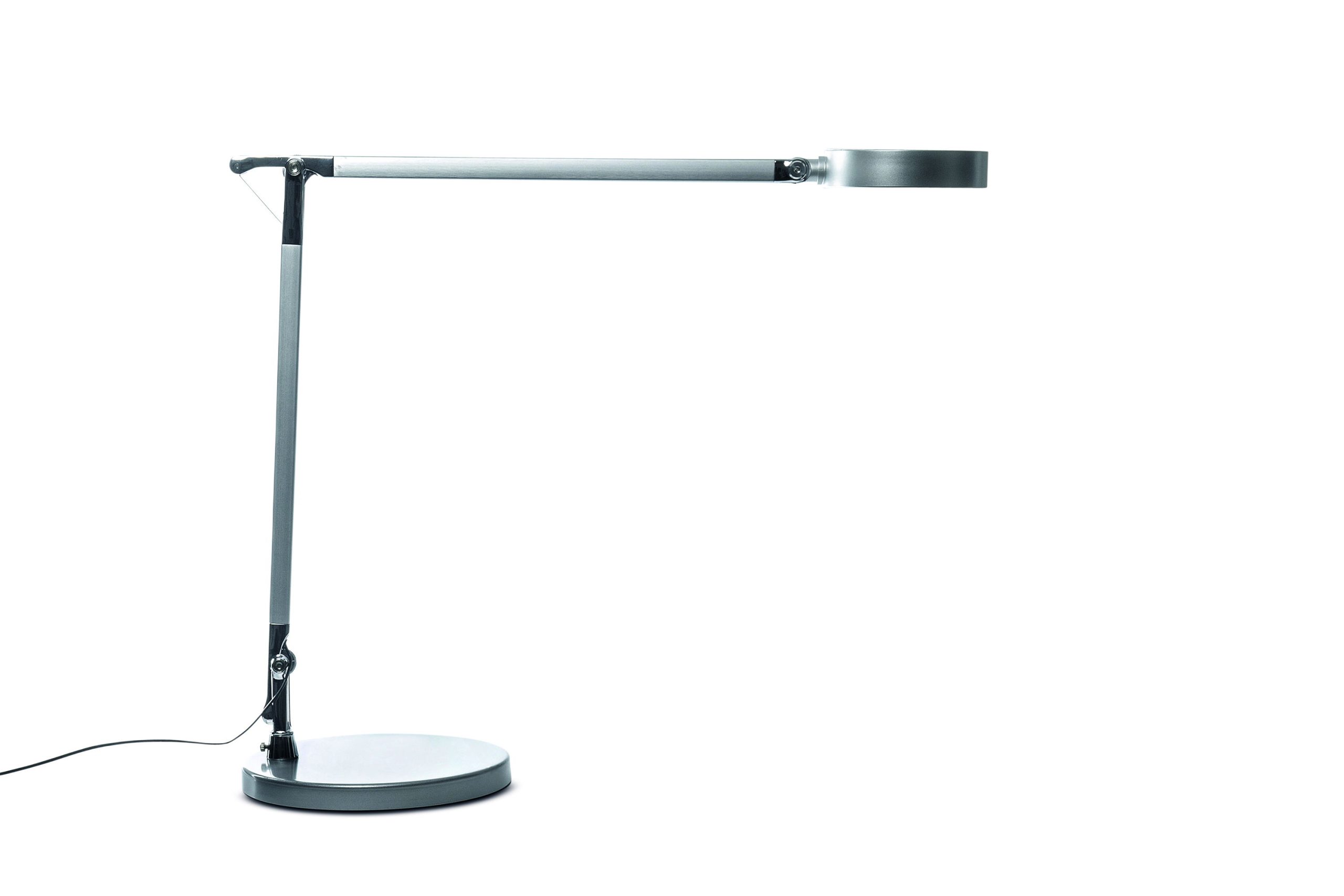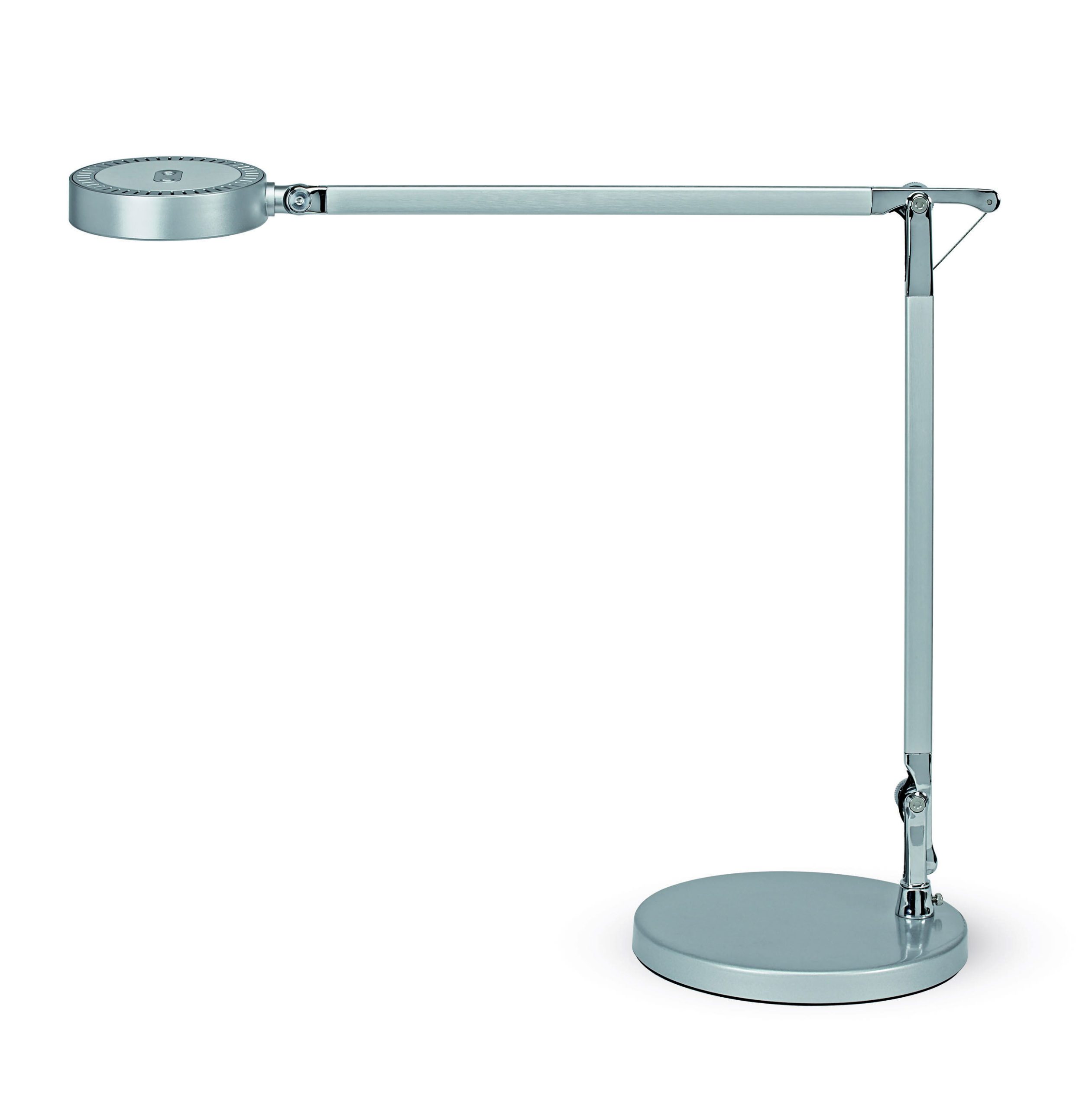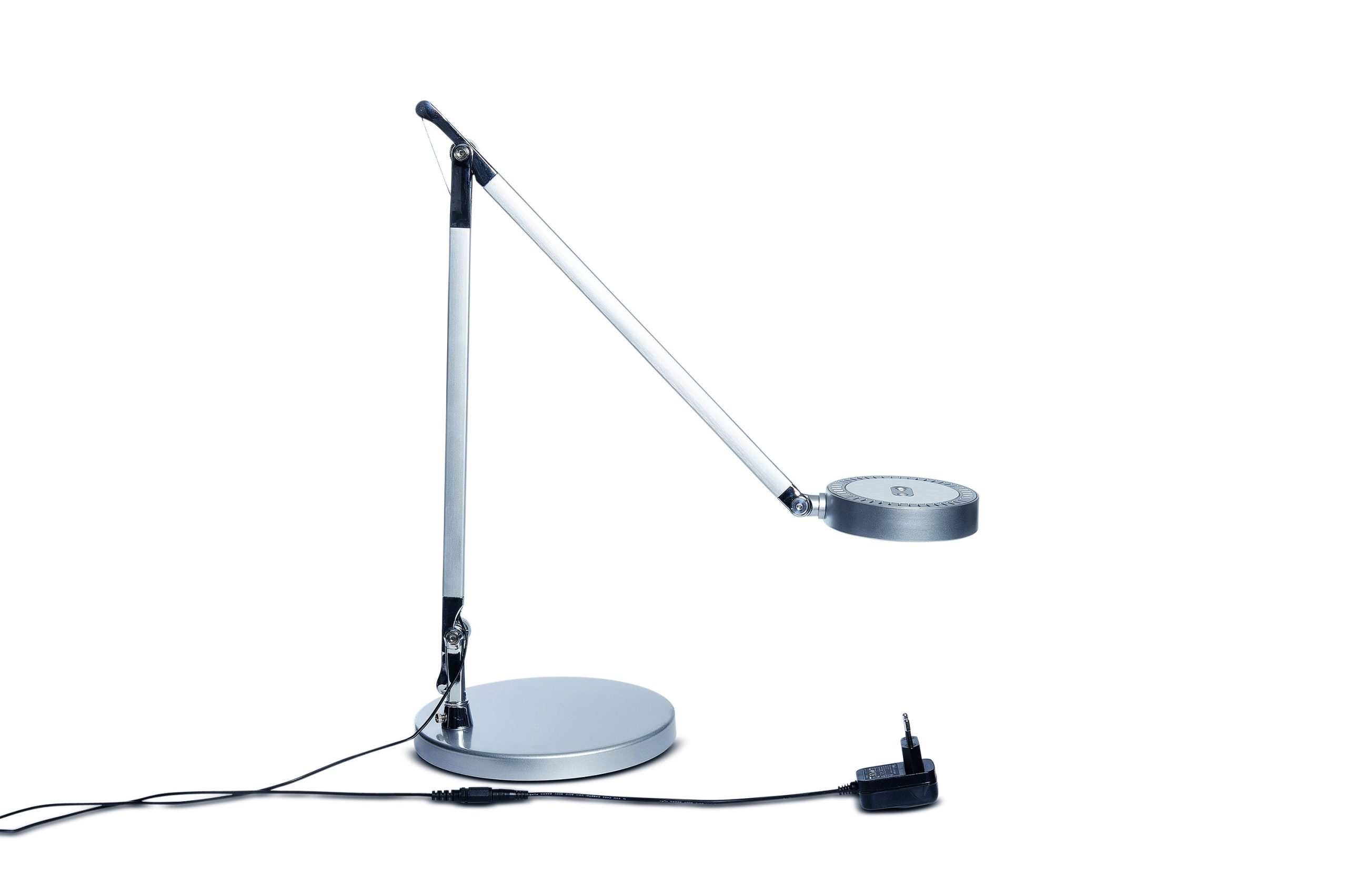 LED Skrivebordslampe, sølv, MAULgrace MAULgrace LED skrivebordslampe er en elegant og funktionel skrivebordslampe i sølv, skabt til moderne arbejdspladser og hjemmekontorer. Lampen kombinerer et eksklusivt udtryk med avanceret lysteknologi, så du får optimal belysning til enhver opgave og tidspunkt på dagen. Den indbyggede LED-lyskilde kan justeres trinløst fra varm hvid 3000 Kelvin til kølig dagslyshvid 6500 Kelvin. Det gør det muligt at tilpasse lyset efter behov fra en behagelig, afslappende stemning til koncentreret arbejdslys. Lysstyrken kan samtidig dæmpes via en 4-trins dæmper, så du får fuld kontrol over både intensitet og farvetemperatur. Betjeningen foregår nemt via touch-knapper placeret direkte på lampehovedet. Lampen har desuden memory-funktion, som gemmer dine seneste indstillinger, når den slukkes. Det dobbelte armled i børstet og anodiseret aluminium giver en stor arbejdsradius og fleksibel bevægelse. Både arm og lampehoved kan vippes og drejes, så lyset rettes præcist mod arbejdsfladen. Den integrerede diffuser reducerer skygger og sikrer et behageligt, jævnt lys. Ved 35 cm afstand leverer lampen op til 1.400 lux, hvilket giver gode arbejdsforhold ved skrivebordet. Den runde metalfod med indlagt vægt sikrer stabilitet. Lampen leveres med 2 meter kabel og ekstern strømforsyning. Energiklassen for lyskilden er F (AG skala), og lampen har en forventet levetid på op til 20.000 timer. Mål: L 545 x B 205 x H 466 mm Hoved: Ø 11,6 cm Armlængde: 36,5 cm (øverste og nederste arm) Fod: Ø 20,5 cm 2 års garanti