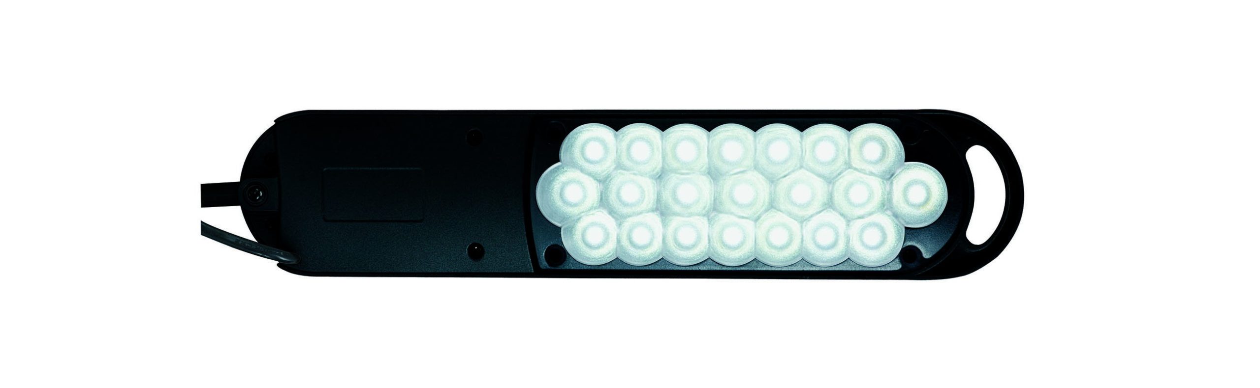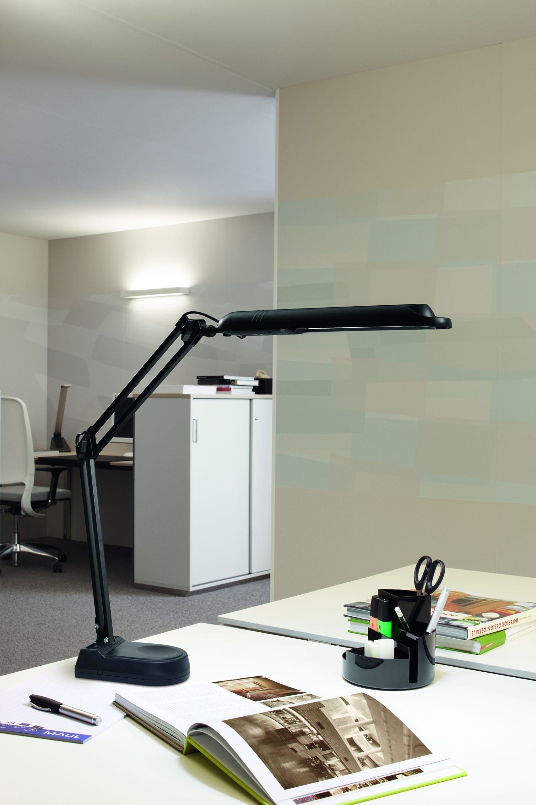 LED skrivebordslampe med fod, sort, MAULatlantic MAULatlantic LED skrivebordslampe i sort er en funktionel og driftssikker arbejdslampe, udviklet til kontor, hjemmearbejdsplads og institutioner. Lampens klassiske arkitektdesign med dobbelt arm gør det nemt at tilpasse lyset præcist til arbejdsområdet, uanset om du læser, skriver eller arbejder ved computer. Den lange, smalle lampehoved fordeler lyset jævnt over skrivebordet og sikrer en behagelig arbejdsbelysning uden generende skygger. Armen kan justeres trinvis og giver stor bevægelsesfrihed, så du hurtigt kan ændre både højde og rækkevidde. Den stabile fod sørger for, at lampen står sikkert, selv når armen er fuldt udfoldet. Skrivebordslampen er udstyret med integreret LED-lyskilde. Lampen leverer op til 2.140 lux ved 35 cm afstand og har en farvetemperatur på 6.500 Kelvin, hvilket giver et klart dagslyshvidt lys. Den tændes og slukkes via en kontakt på lampehovedet. Den integrerede LED-lyskilde har energiklasse D (A–G skala) og et lavt energiforbrug på 6 kWh/1000 timer. Den forventede levetid er op til 10.000 timer. MAULatlantic er GS-certificeret af Intertek for dokumenteret sikkerhed og kvalitet. Lyskilde og driftsenhed kan udskiftes af elektriker. Tænd/sluk-knappen er placeret på lampehovedet for nem betjening. Mål: H 41 cm Hoved: 33 x 7 cm Nederste arm: 33 cm Øverste arm: 34 cm Fod: ca. 20 x 14 cm