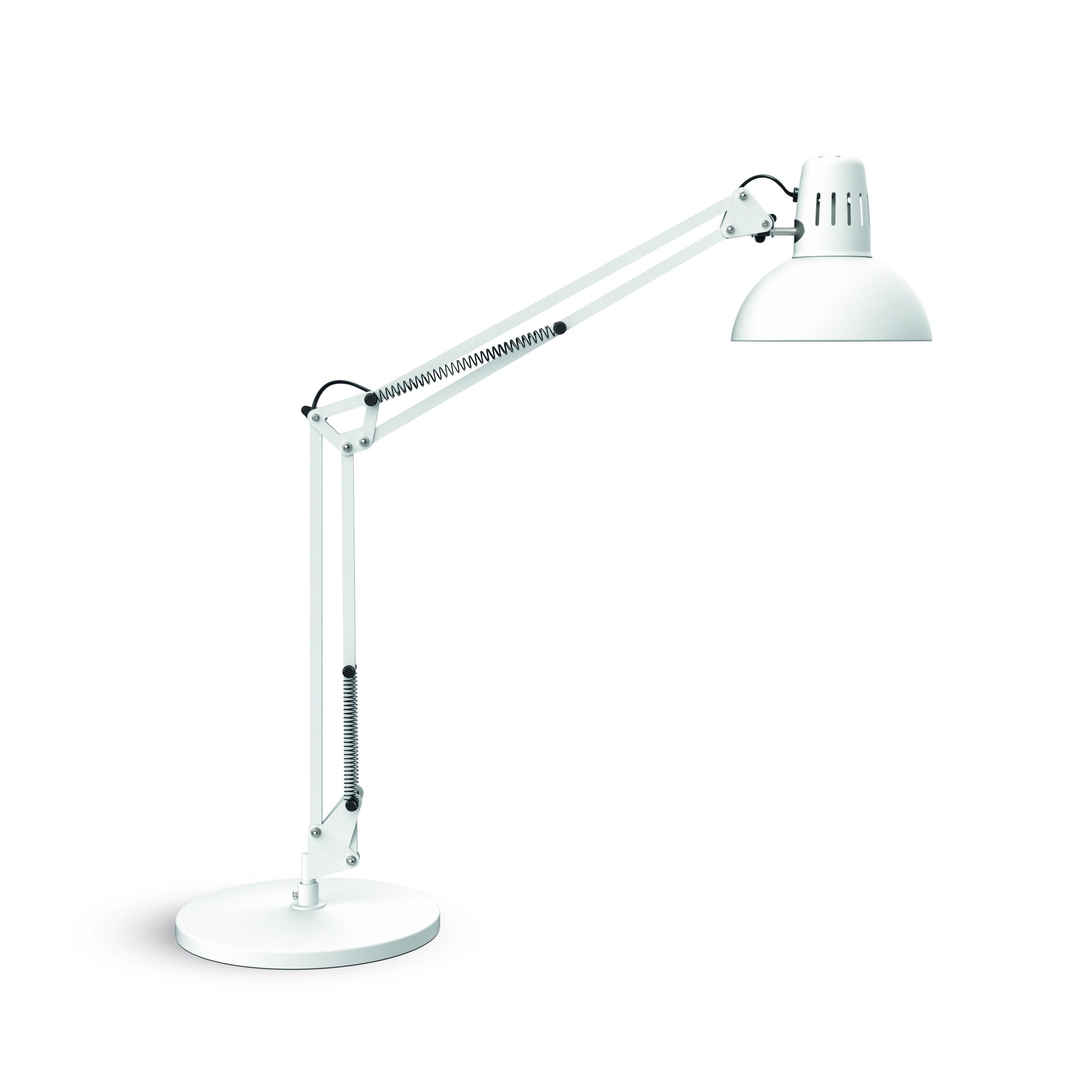 LED skrivebordslampe med fod, hvid, MAULstudy MAULstudy LED skrivebordslampe med fod er en klassisk arbejdslampe i et enkelt og funktionelt design, der passer perfekt til både kontor og hjemmearbejdsplads. Lampen er udstyret med en solid metalarm med fjedermekanisme, som gør det let at justere lyset præcist, hvor du har brug for det. Både arm og lampehoved kan vippes og drejes. Den tunge, runde metalfod sikrer ekstra stabilitet og gør det muligt at strække armen langt ud uden, at lampen mister balancen. Lampeskærmen i metal har reflektor, der giver en god og målrettet lysfordeling. Skrivebordslampen anvender en E27 fatning og kan bruges med LED-lyskilde (pære medfølger ikke). Det giver dig frihed til selv at vælge den lysstyrke og farvetemperatur, der passer bedst til dit behov. Tænd/sluk-knappen er placeret på ledningen for nem og enkel betjening. En pålidelig og robust skrivebordslampe med 2 års garanti. Mål: L 695 x B 230 x H 490 mm Hoved: Ø 17 cm Armlængde: 35 cm (øverste og nederste arm) Fod: Ø 23 cm