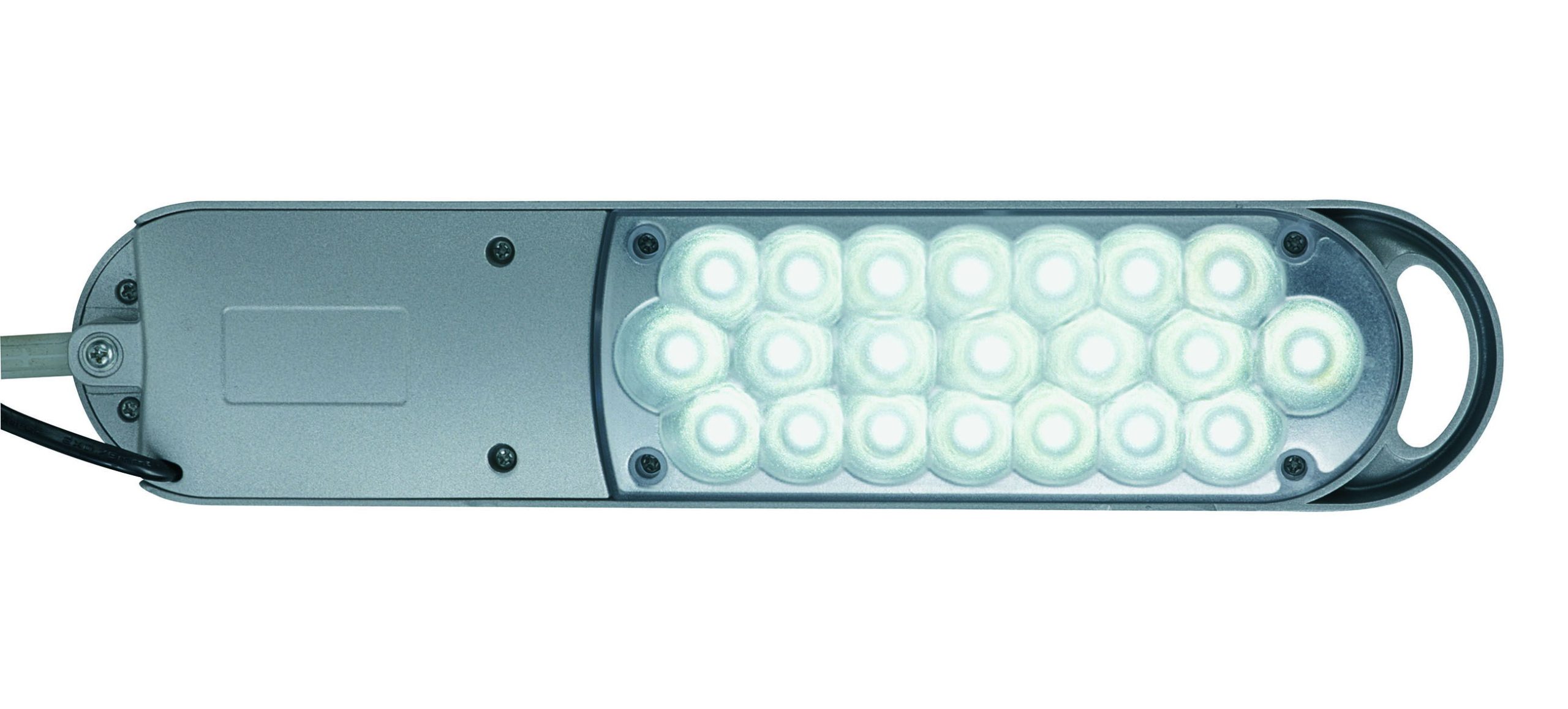 LED skrivebordlampe med bordklemme, sølv, MAULatlantic MAULatlantic LED skrivebordslampe med bordklemme er en kraftfuld og professionel arbejdslampe, udviklet til kontormiljøer. Den integrerede LED-lyskilde giver et klart dagslyshvidt lys på 6.500 Kelvin, som understøtter præcisionsarbejde. Ved 35 cm afstand yder lampen op til 2.140 lux, hvilket sikrer effektiv belysning af arbejdsfladen. Reflektoren i lampehovedet bidrager til en jævn lysfordeling. Lyskilden har energieffektivitetsklasse D (AG skala). Lampen betjenes via tænd/sluk-knap på lampehovedet. Både lampehoved og arm kan vippes og drejes, så lyset nemt tilpasses den enkelte opgave. Den solide metalbordklemme med skrivebordsbeskyttelse passer til bordplader med en tykkelse op til 55 mm og sikrer stabil montering. Skrivebordslampen er GS-certificeret af Intertek for dokumenteret sikkerhed og kvalitet. Lyskilde og driftsenhed kan udskiftes af elektriker. Lampen leveres med 1,8 meter ledning og eurostik og har 2 års garanti. Mål: H 38 cm Hoved: 33 x 7 cm Nederste arm: 33 cm Øverste arm: 34 cm Klemvidde: 055 mm