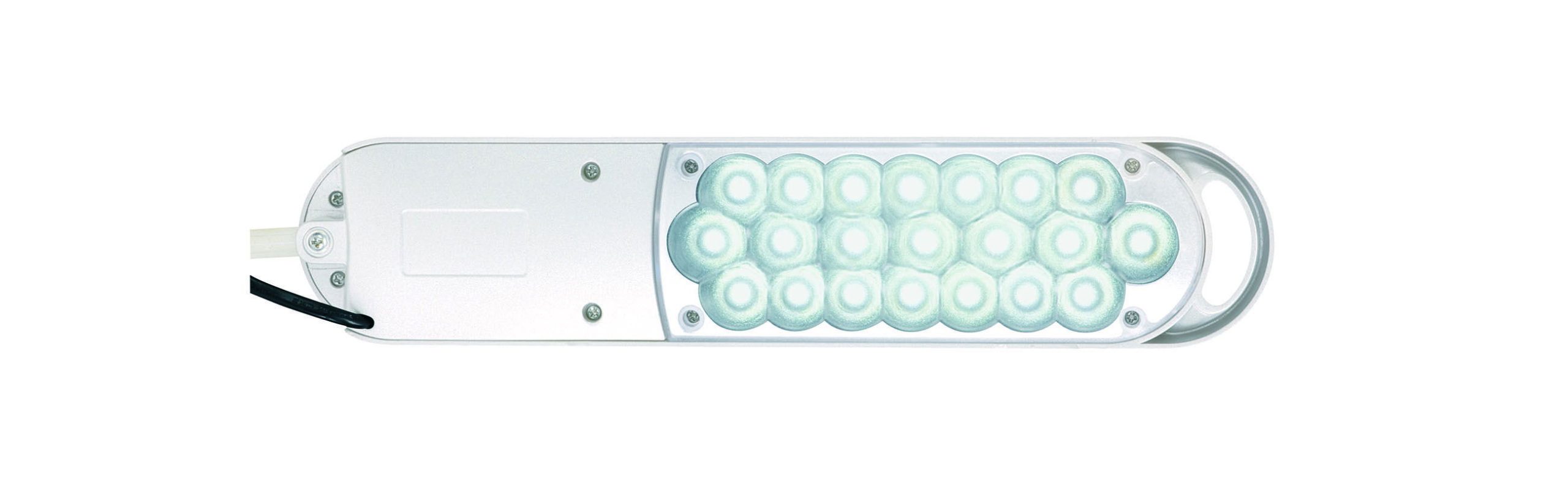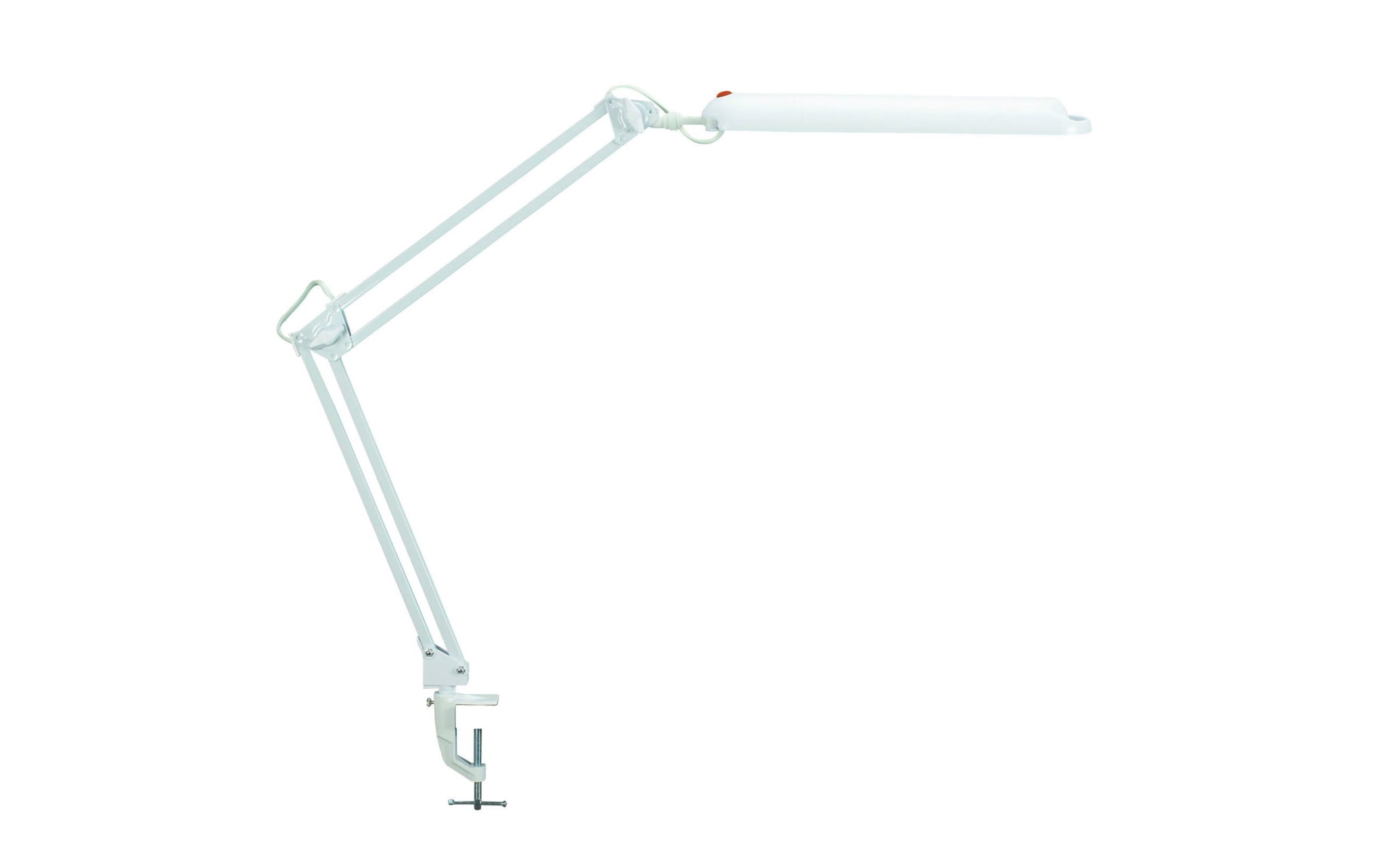 LED skrivebordlampe med bordklemme, hvid, MAULatlantic MAULatlantic LED skrivebordslampe med bordklemme er en kraftfuld og professionel arbejdslampe, udviklet til kontormiljøer. Den integrerede LED-lyskilde giver et klart dagslyshvidt lys på 6.500 Kelvin, som understøtter præcisionsarbejde. Ved 35 cm afstand yder lampen op til 2.140 lux, hvilket sikrer effektiv belysning af arbejdsfladen. Reflektoren i lampehovedet bidrager til en jævn lysfordeling. Lyskilden har energieffektivitetsklasse D (A–G skala). Lampen betjenes via tænd/sluk-knap på lampehovedet. Både lampehoved og arm kan vippes og drejes, så lyset nemt tilpasses den enkelte opgave. Den solide metalbordklemme med skrivebordsbeskyttelse passer til bordplader med en tykkelse op til 55 mm og sikrer stabil montering. Skrivebordslampen er GS-certificeret af Intertek for dokumenteret sikkerhed og kvalitet. Lyskilde og driftsenhed kan udskiftes af elektriker. Lampen leveres med 1,8 meter ledning og eurostik og har 2 års garanti. Mål: H 38 cm Hoved: 33 x 7 cm Nederste arm: 33 cm Øverste arm: 34 cm Klemvidde: 0–55 mm