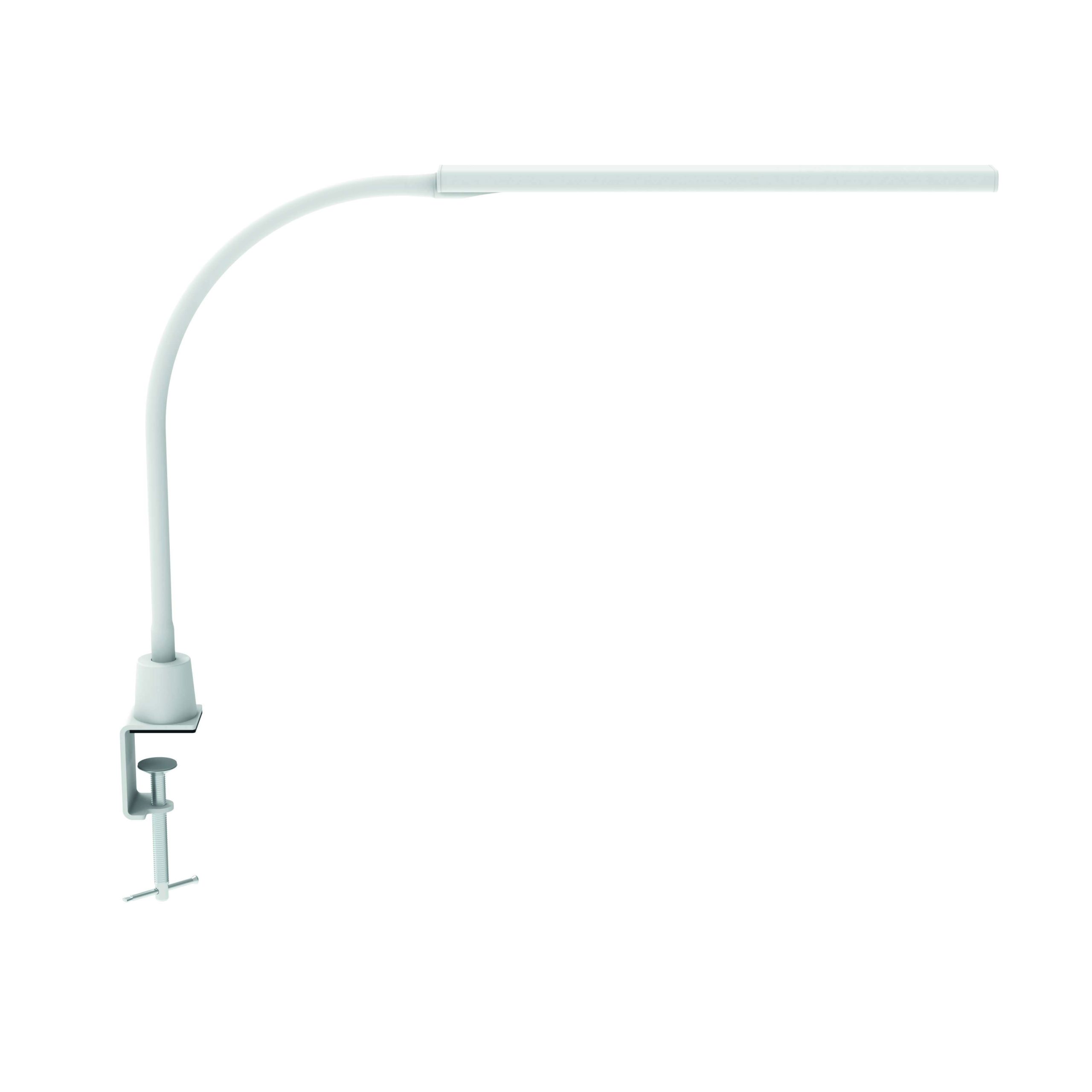 LED skrivebordslampe med bordklemme, hvid, MAULpirro MAULpirro LED skrivebordslampe med bordklemme i hvid er en enkel og pladsbesparende løsning til dig, der ønsker funktionelt arbejdslys i et stilrent design. Den slanke lampe passer perfekt til kontorer, hvor bordpladsen skal udnyttes optimalt. Den integrerede LED-lyskilde giver et behageligt, varmt hvidt lys på 3000 Kelvin. Lysstyrken kan justeres i 4 trin direkte via touch-knappen på lampehovedet, så du nemt kan tilpasse belysningen efter opgave og tidspunkt på dagen. Den indbyggede diffuser reducerer skygger og sikrer en jævn lysfordeling. Ved 35 cm afstand leverer lampen op til 1.120 lux. Armen er fremstillet i metal med gummieret overflade og er fuldt fleksibel, så du præcist kan justere lysretningen. Bordklemmen i metal passer til bordplader med en tykkelse op til 45 mm og sikrer stabil montering uden at optage bordplads. Lampen leveres med ca. 1,5 meter kabel og ekstern strømforsyning. Lyskilden er energieffektivitetsklasse E (A–G skala) og har en lang levetid på op til 50.000 timer. Mål: L 460 x B 40 x H 373 mm Armlængde: ca. 380 mm Hoved: 32 x 3,2 x 1,3 cm Klemvidde: 0–45 mm