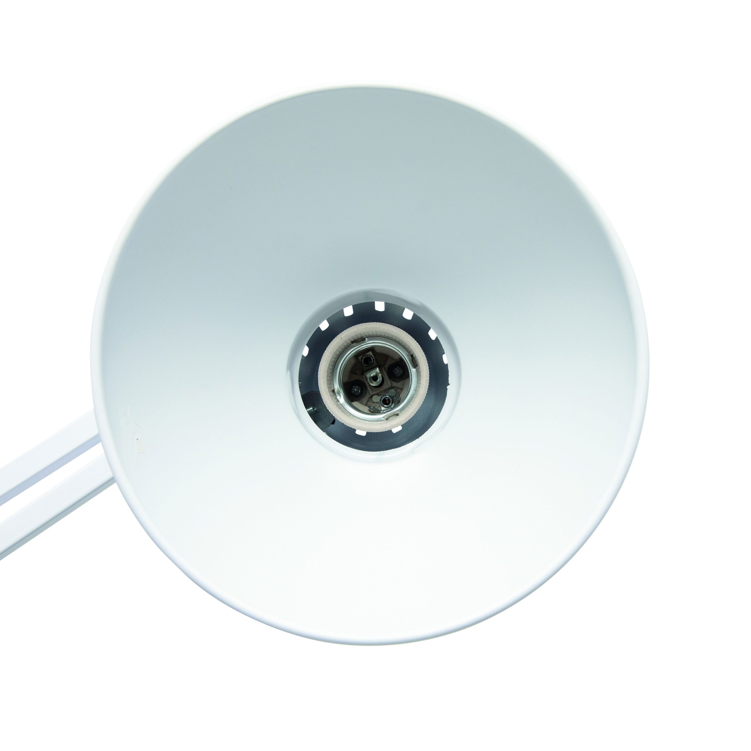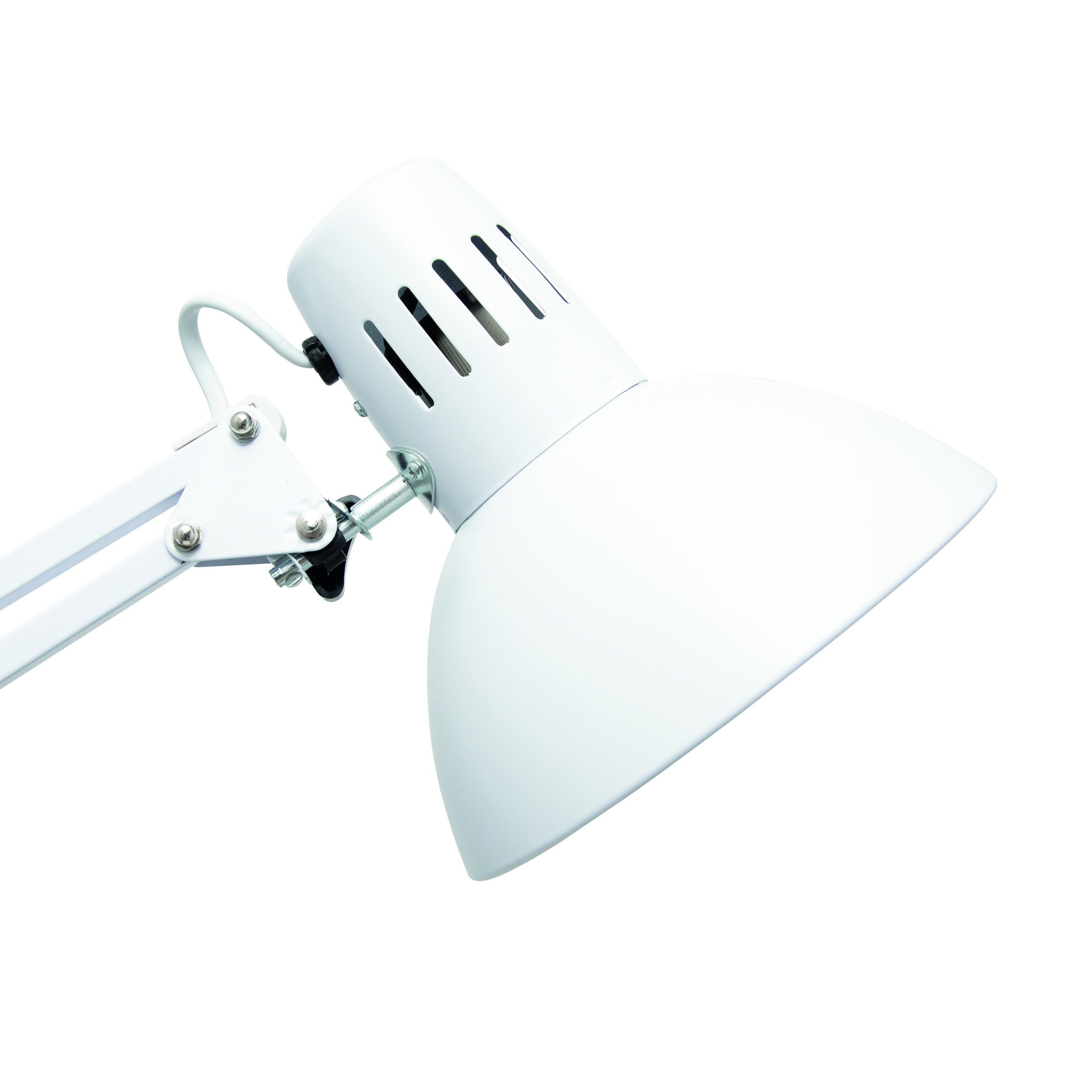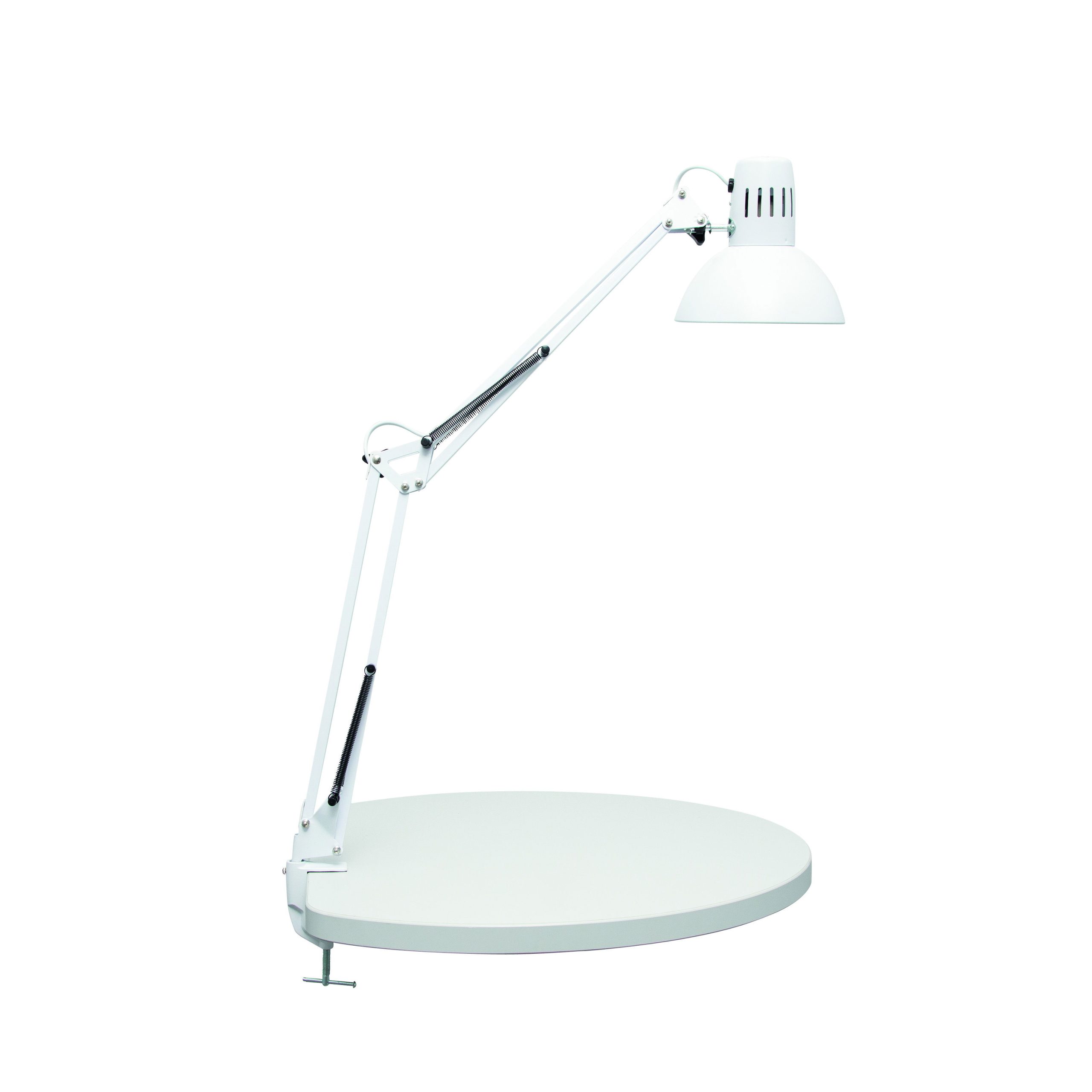 LED skrivebordslampe med bordklemme, hvid, MAULstudy MAULstudy LED skrivebordslampe med bordklemme er en tidløs arbejdslampe, som er ideel til kontor, værksted eller hjemmearbejdsplads, hvor du har brug for stabil og fleksibel belysning uden at optage plads på bordet. Lampen monteres nemt med den robuste metalbordklemme, som passer til bordplader op til til 5,5 cm i tykkelse. Det giver en stabil fastgørelse og frigør samtidig bordplads. Den solide metalarm med fjedermekanisme gør det let at justere lampen i præcis den position, du har brug for. Både arm og lampehoved kan vippes og drejes, så lyset altid rammer arbejdsområdet optimalt. Lampeskærmen i metal har en indvendig reflektor, der sikrer en god og koncentreret lysfordeling. Lampen har E27 fatning og kan anvendes med LED-lyskilde (pære medfølger ikke), så du selv kan vælge den lysstyrke og farvetemperatur, der passer til dit behov. Tænd/sluk-knappen er placeret på ledningen for nem og enkel betjening. Lampen leveres med ca. 1,8 meter kabel og har 2 års garanti. Mål: L 595 x B 170 x H 440 mm Hoved: Ø 17 cm Armlængde: 35 cm (øverste og nederste arm) Klemvidde: 0–55 mm