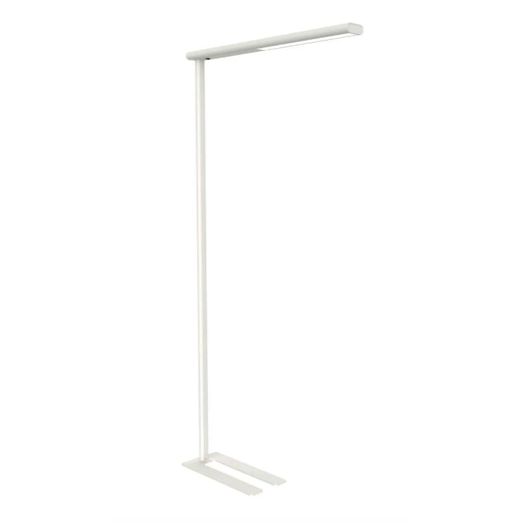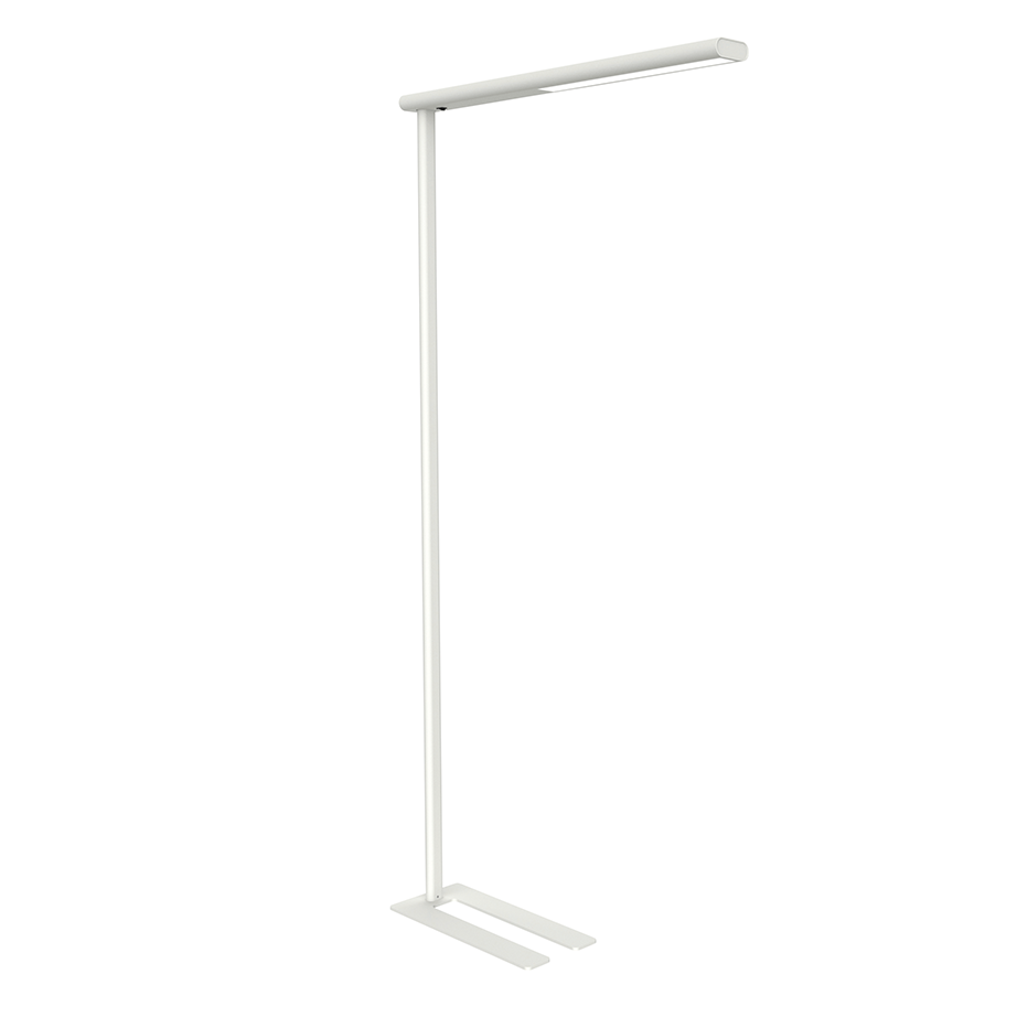 LED Gulvlampe, hvid, MAULjet MAULjet er en slank og moderne LED-gulvlampe, der er skabt til at give en behagelig belysning i ethvert arbejdsrum. Denne gulvlampe anvender en intelligent lysfordeling, hvor 65% af lyset rettes opad for at skabe en behagelig, indirekte belysning i rummet, mens 35% af lyset rettes nedad for at oplyse arbejdsområdet direkte. Lyset har en neutral hvid farvetemperatur (4000 Kelvin). Moderne LED-teknologi sikrer lampen en høj energieffektivitet og et minimalt strømforbrug. LED-lyskilderne har en levetid på op til 50.000 timer. Lampehoved og søjle er fremstillet af hvidt aluminium, mens foden er fremstillet af hvidt stål med skridsikre gummipuder under. Gulvlampen har en stabil fod, som er designet til at passe rundt om bordbenene på et skrivebord. Lampen er udviklet i Tyskland af MAUL. Alle kontorlamper fra MAUL er designet til at kunne repareres og genanvendes fremfor at blive kasseret. Derfor har alle lamperne udskiftelige lyskilder og betjeningsenheder. Produktet har 2 års garanti og emballagen er fuldt genanvendelig. Standerlampen har det anerkendte, tyske GS sikkerhedscertifikatet, som indikerer, at den overholder de gældende tyske standarder for produktsikkerhed. TÜV Rheinland og GS sikkerhedscertifikat, kvalitetsmærke for testede og sikre produkter. Mål: Højde: 195 cm Lampehoved: 95 x 9,8 x 3,7 cm Fod: 50 x 22,5 cm Ledning: 1,80 m Vægt: 9,2 kg. Specifikationer: Lysstyrke (indirekte lys): 1.520 lux ved 85 cm, 920 lux ved 110 cm afstand. Lysstyrke (direkte lys): 1.280 lux ved 85 cm, 780 lux ved 110 cm afstand. Lysstrøm: 5.835 lumen (3.218 lumen indirekte & 2.617 lumen direkte). Energiforbrug: 42 kWh/1000 timer (21 kWh/1000 h pr. lyskilde). Energieffektivitet: Klasse D (indirekte lys) og Klasse E (direkte lys). Spektrum A-G.