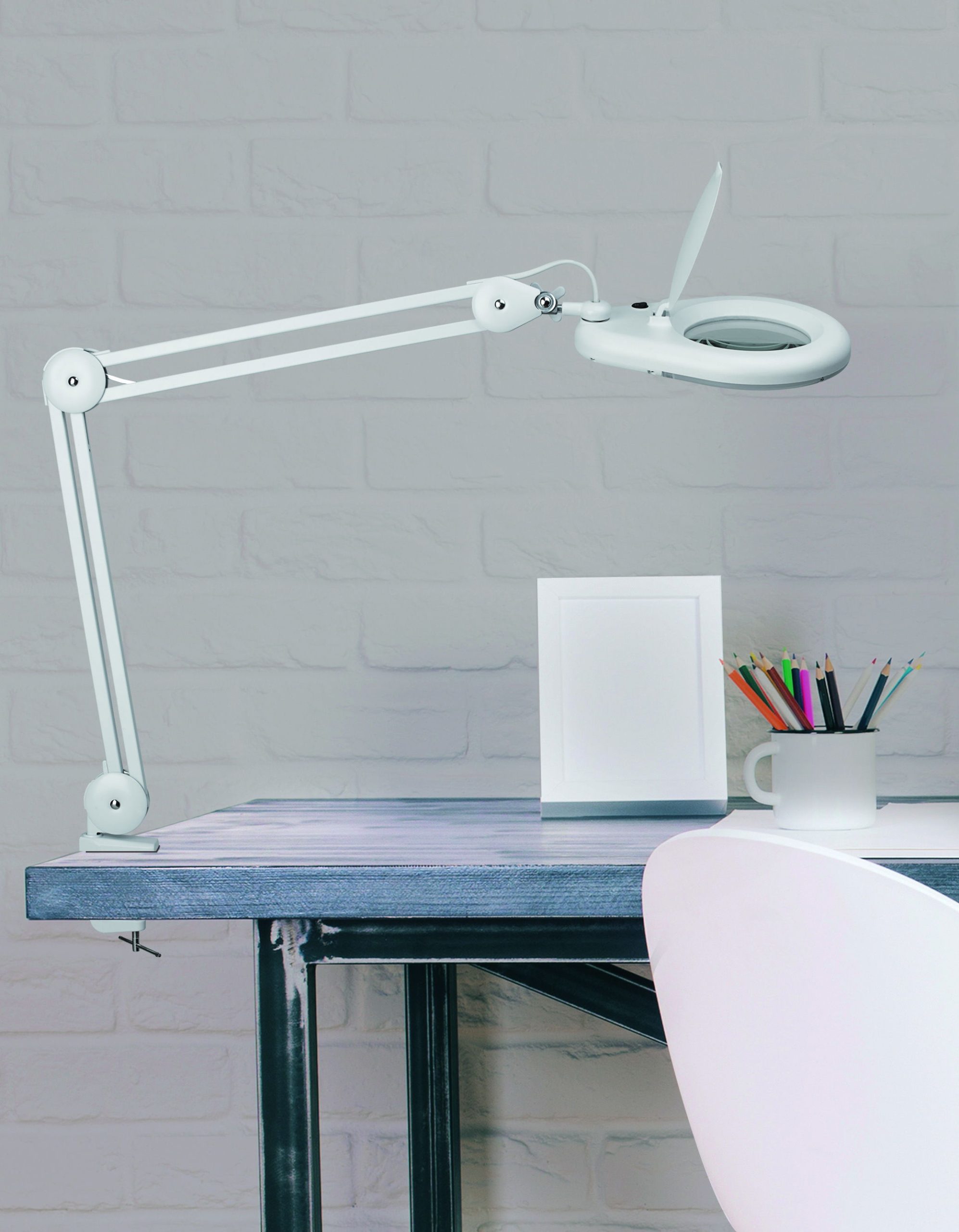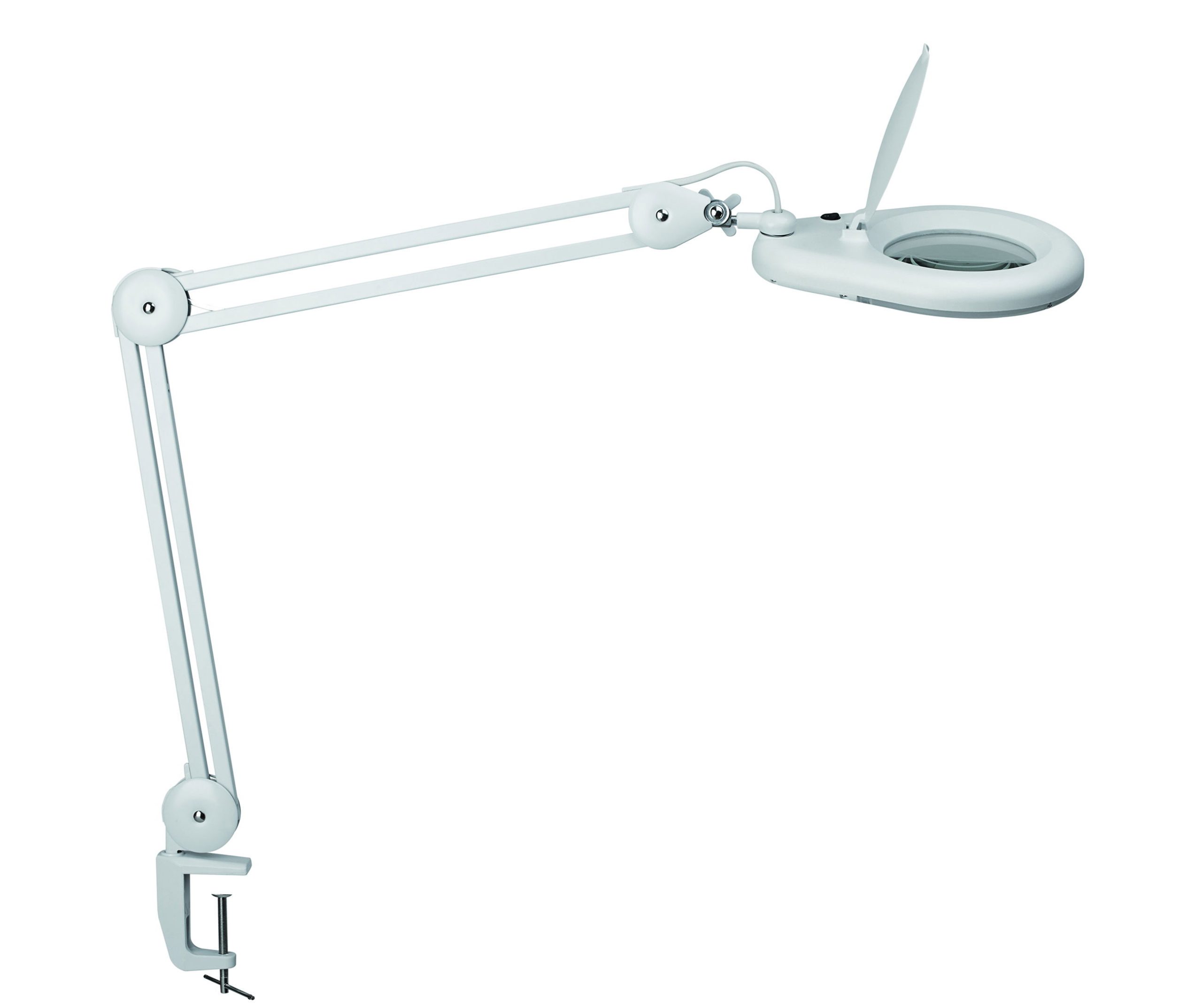 LED luplampe med bordklemme, hvid, MAULviso MAULviso LED luplampe med bordklemme er en funktionel og stilren løsning til dig, der har brug for både godt arbejdslys og forstørrelse i én og samme lampe. Den er ideel til præcisionsarbejde, hobbyprojekter, klinikbrug eller som ekstra læsehjælp ved skrivebordet. Den runde LED-lyskilde er placeret hele vejen rundt om linsen og giver et jævnt, behageligt og skyggefrit lys. Det dagslyshvide lys (6500 kelvin) gør det nemt at se detaljer tydeligt og arbejde koncentreret i længere tid. Samtidig har lampen et lavt energiforbrug og lang levetid, så du får en driftssikker løsning til daglig brug. Den integrerede glaslinse på 3 dioptri forstørrer med 75% og har en diameter på 12,7 cm. Den store linse gør det nemt at arbejde med små genstande som elektronik, håndarbejde, smykker eller dokumenter med små detaljer. En praktisk klap beskytter linsen mod støv, når lampen ikke er i brug. Luplampen er udstyret med en stærk metalarm i parallelogram-design, som gør det let at justere lampen præcist i den ønskede position. Både arm og lampehoved kan vippes og drejes, så du får maksimal fleksibilitet i dit arbejde. Den solide bordklemme sikrer stabil montering på bordplader og arbejdsstationer. Mål: L 810 x B 200 x H 495 mm Hoved: 26,5 x 20 cm Armlængde: 41 cm (øverste og nederste arm) Kabel: ca. 1,7 m