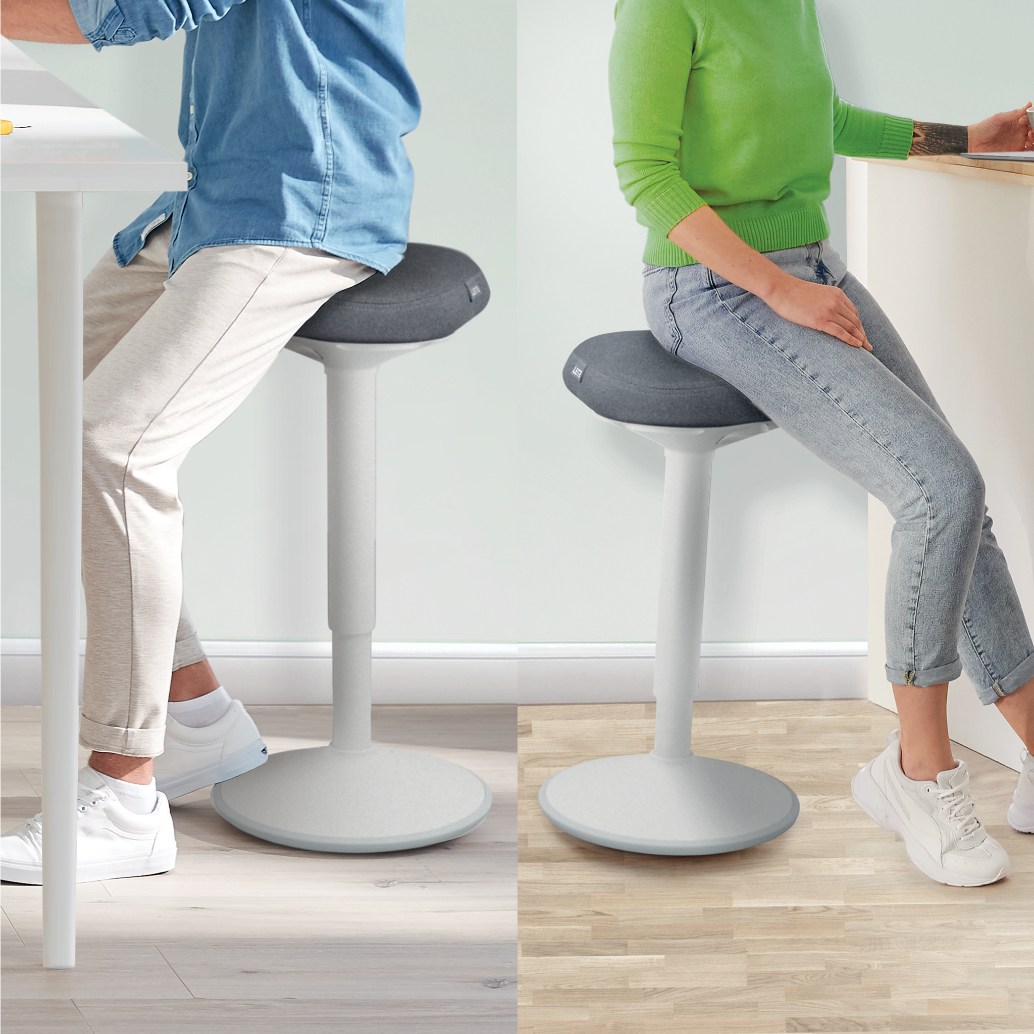 Leitz Ergo Active stol har et unikt komfortsæde i Dual Density Foam (DDF) med en fast, ergonomisk støttekerne. Den trekantede form minder om en sadelstol og fordeler vægten jævnt over bækkenet og er omgivet af blød skumpolstring for at reducere trykket på lår og ben. Det 9 cm tykke sæde er designet til komfort og kan bruges til at læne sig op ad som ståstøtte. Denne højdejusterbare ergonomiske balancestol er udviklet i samarbejde med Institut for Sundhed og Ergonomi (IGR) og er designet til at holde dig aktiv derhjemme eller på arbejdet, når du bruger et hæve-sænke skrivebord, høje mødeborde eller køkkenbordet. Stolens afrundede base opfordrer til aktiv bevægelse ved at dreje og vugge, mens du arbejder, hvilket styrker din ryg og core og hjælper til at forebygge ømhed og smerter. Jævn og nem højdejustering på 25 cm (57 – 82 cm) med et tryk på en knap for at skifte til den perfekte ståstøttehøjde. Betrækket er lavet af 100% recirkuleret materiale, og den skridsikre gummibase forhindrer taburetten i at glide og beskytter samtidig dine gulve. Letvægtsdesignet og bærehåndtaget under sædet gør den nem at flytte fra rum til rum, og den kan nemt opbevares under et skrivebord. Denne moderne og minimalistiske arbejdsstol er ideel til dit hjem eller kontor for at øge komforten og maksimere produktiviteten. Det er vores mission at levere løsninger, der kan give mennesker mulighed for at trives på arbejdet og derudover fremme positiv mental sundhed og fysisk velbefindende. Kombiner med mange andre Leitz Ergo-produkter for at skræddersy din fleksible og individuelle sid, stå & bevæg-arbejdsstation. Hold dig aktiv og HAV DET GODT med Leitz.